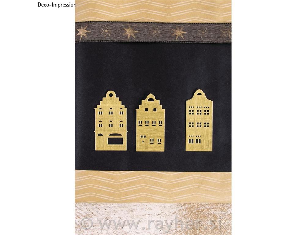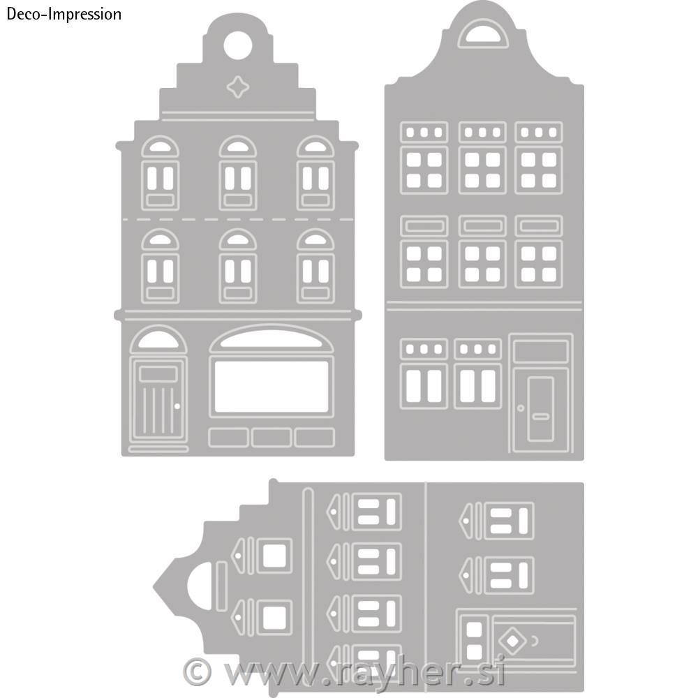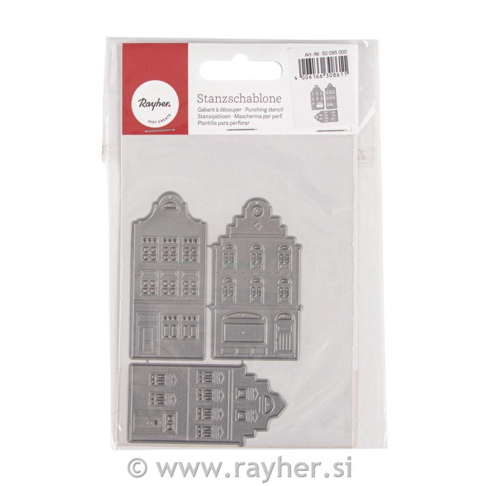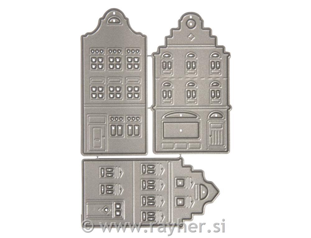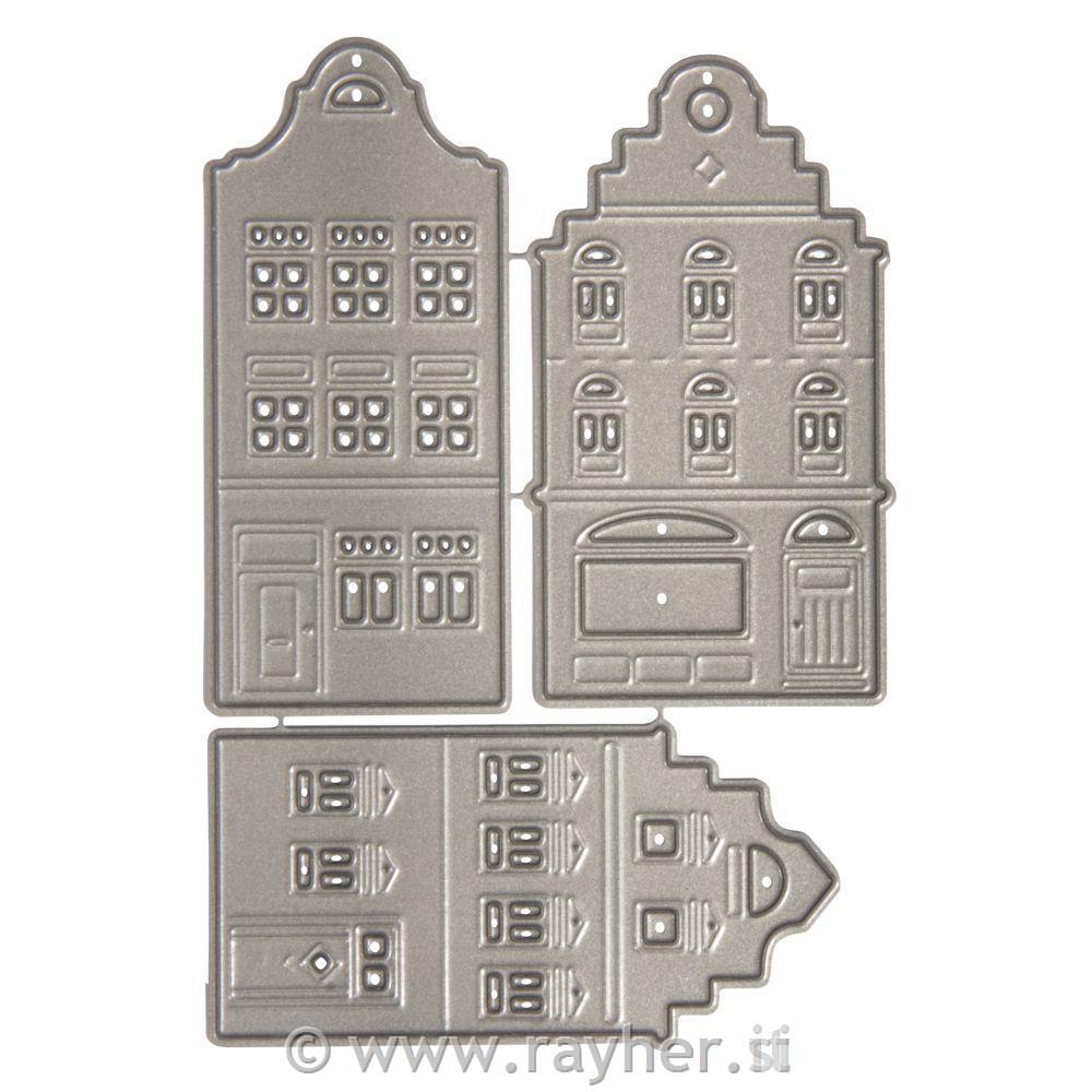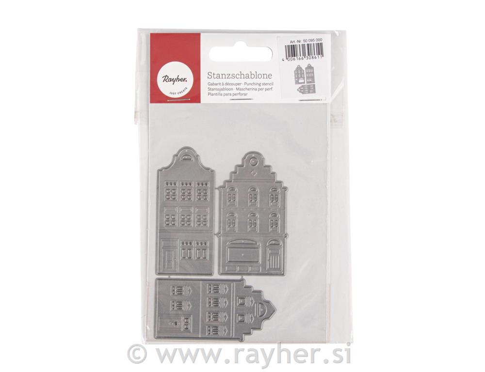 V setu so trije različni motivi hiš v velikostih 3x7 cm, 3,2x6,5 cm in 3,5x6,7 cm.