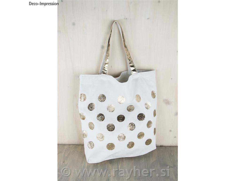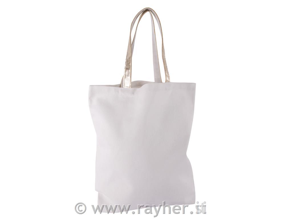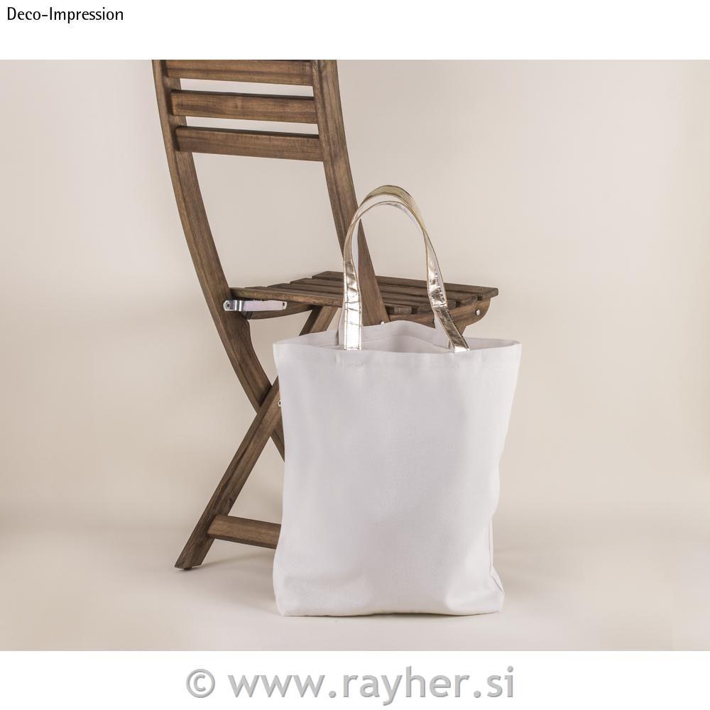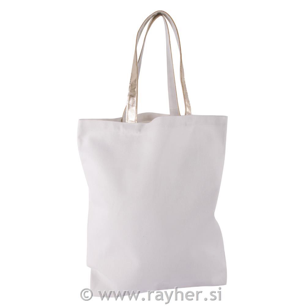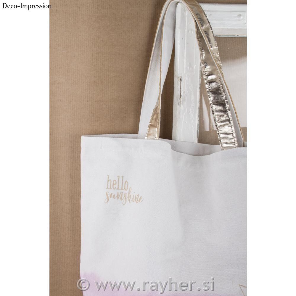 Fashion shopper vrečka, 46 x 46 x 11 cm (širina/višina/globina), na voljo v beli ali trendi sivi barvi, ročaji so prevlečeni s sintetičnim usnjem zlate barve, ročaj je dolg 24 cm. Blago je pralno pri 30 °C (nežen cikel), likano (nizka temperatura, 110 °C), primerno za sušenje v sušilnem stroju (nizka temperatura, nežno). Ni mogoče beliti ali kemično čistiti.
