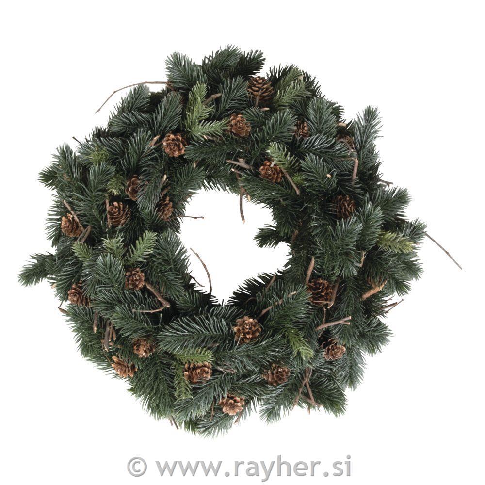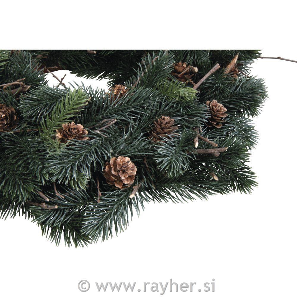 Venec, 40 cm o, iz gosto obdelanih umetnih vej. Jedro je obroč iz stiropora, ovit z rjavim papirjem, ki preprečuje, da bi se beli stiropor prebil skozi. Visokokakovostni umetni venec v naravni jelkovi zeleni barvi, okrašen s pravimi macesnovimi storži in pravimi vejami. Lahko se uporablja za notranje dekoracije ali, kot venec na vratih. Venec lahko dodatno okrasite, mu dodate lučke, dekoracije,…