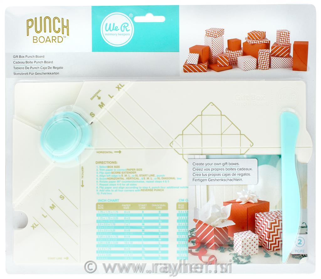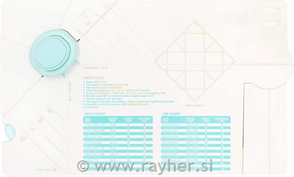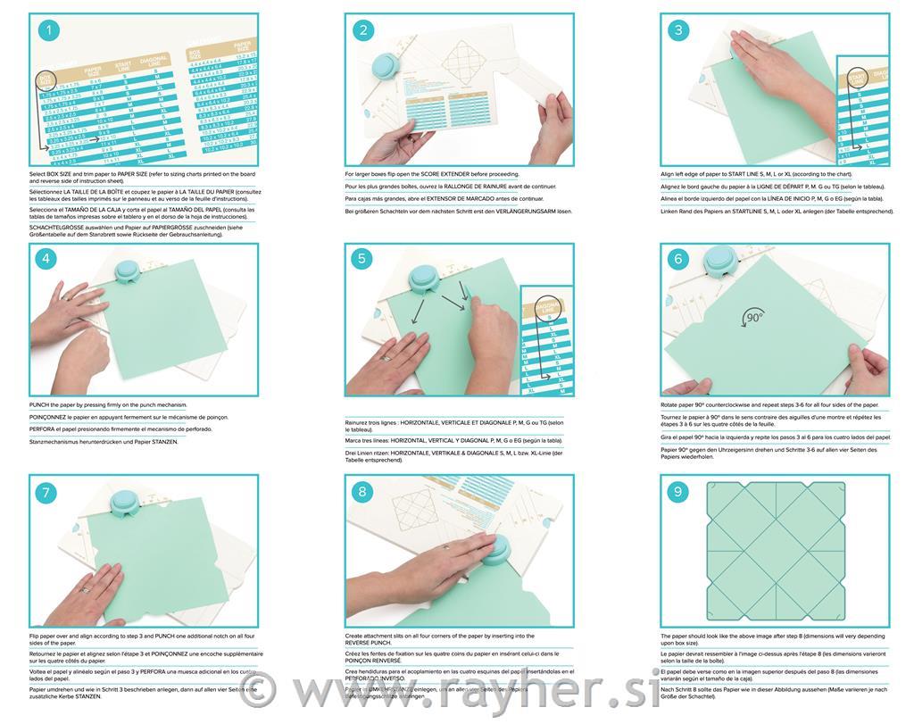 Inovativna rezalna plošča združuje luknjač in orodje za točkovanje, kar olajša izdelavo škatlic v obliki blazine. Enostavna navodila so natisnjena na zadnji strani plošče.