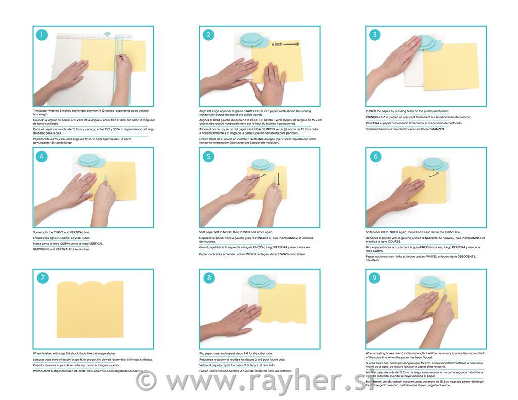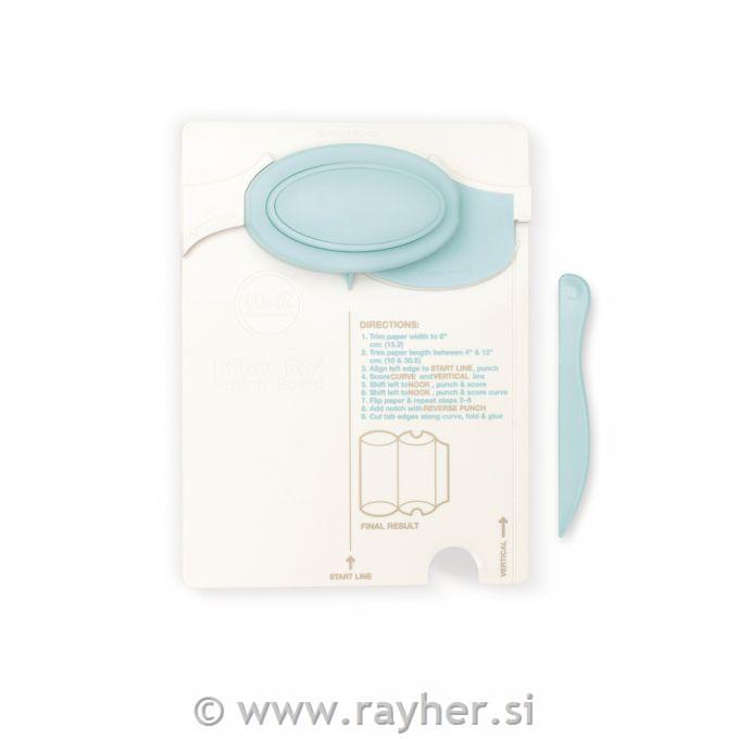 Inovativna rezalna plošča združuje luknjač in orodje za točkovanje, kar olajša izdelavo škatlic v obliki blazine. Enostavna navodila so natisnjena na zadnji strani plošče.