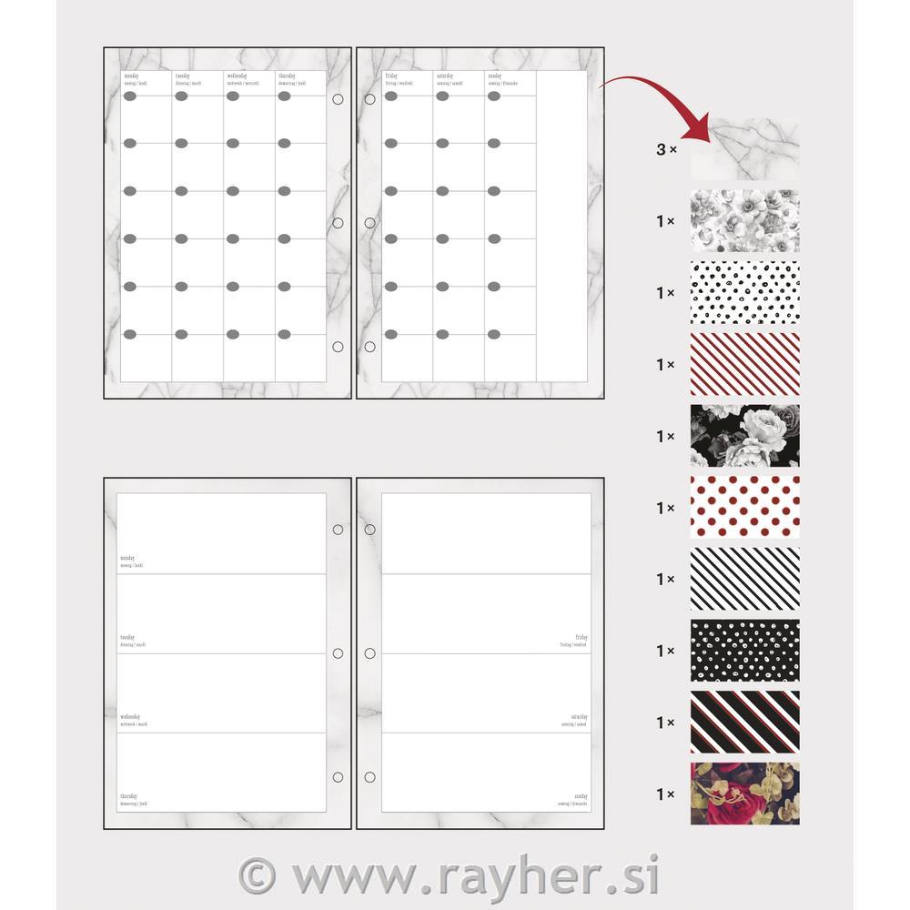Set vsebuje 96 listov, obojestransko potiskanih, perforiranih za vlaganje v Rayherjev Rokovnik (My Planner).
