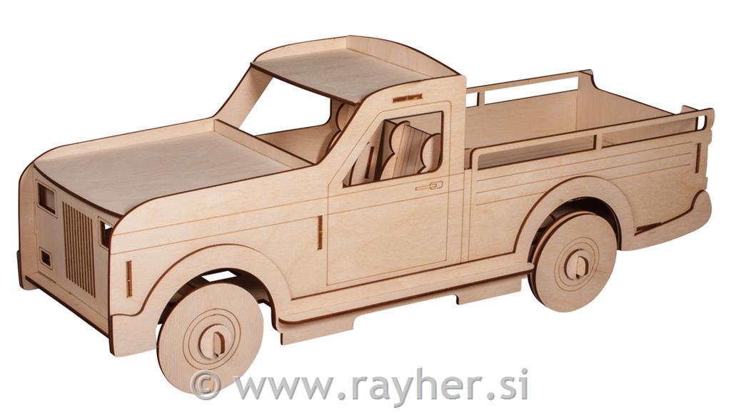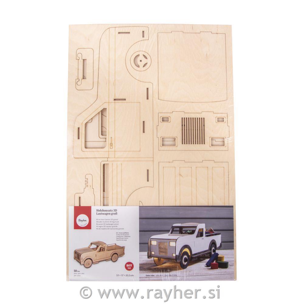 Iz 50-delnega lesenega kompleta iz lesa debeline 3 mm naredite odličen tridimenzionalni 3D tovornjak. Deli s filigranskim laserjem so razdeljeni na 4 lesene plošče in jih je mogoče na mestih priključkov skrbno odstraniti z roko ali majhnim obrtnim nožem.