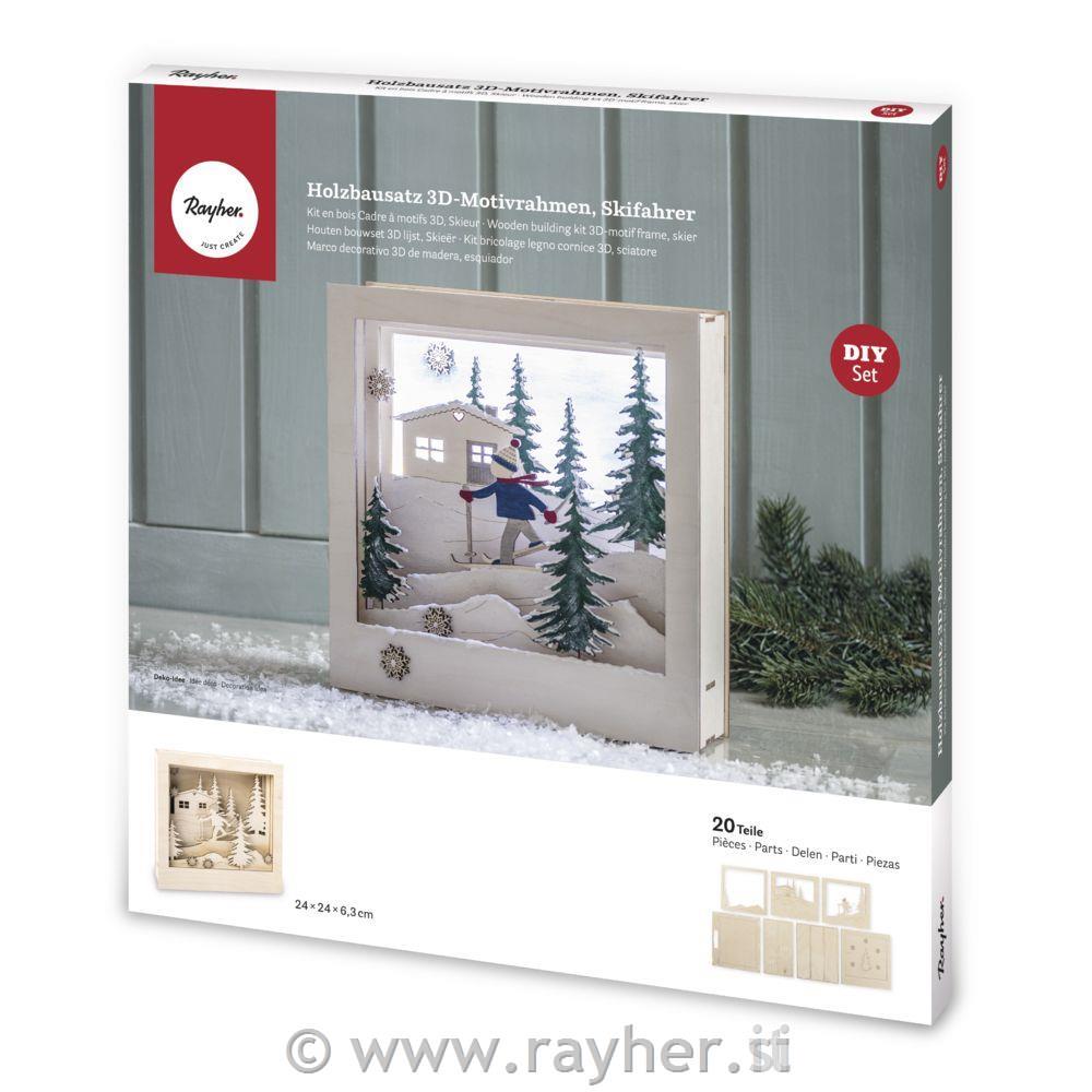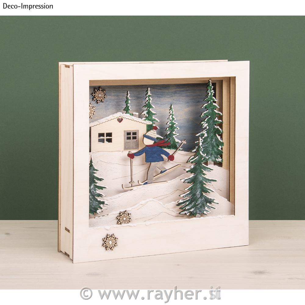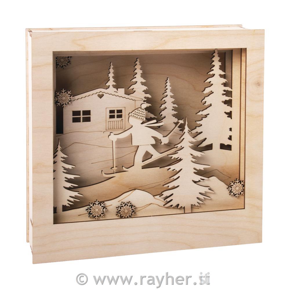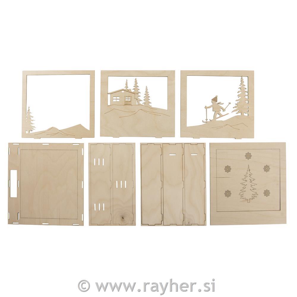 Lasersko izrezan komplet sestavlja 7 lesenih plošč s skupno 20 vnaprej izrezanimi motivi in ustrezen okvir. Potrebovali boste tudi: obrtniški nož (olfa nož), lepilo, barve, bleščice, snow pen,..Komplet je enostaven za sestavljanje in se popolnoma prilega. Z obrtniškim nožem odstranite motive in okvire z lesenih plošč na povezovalnih palicah in vse dele sestavite v škatlo.