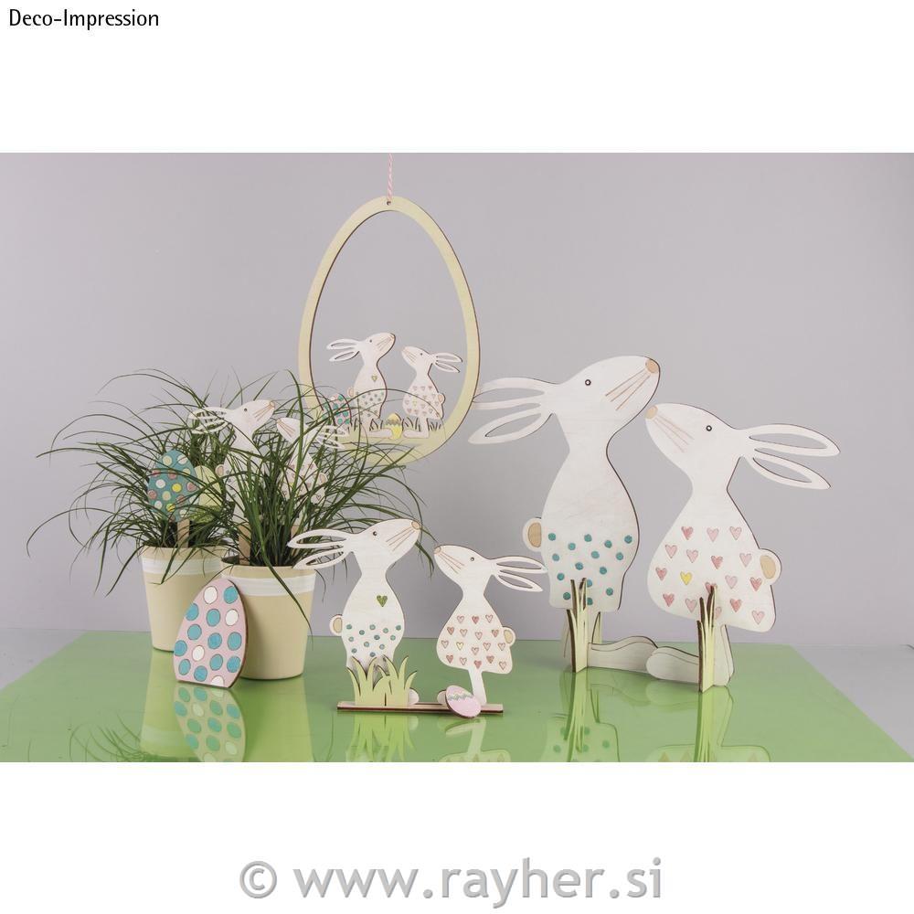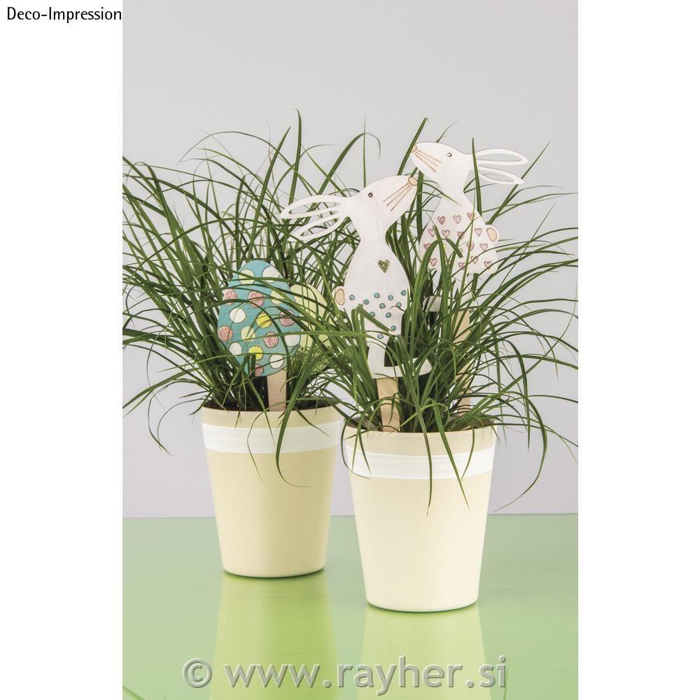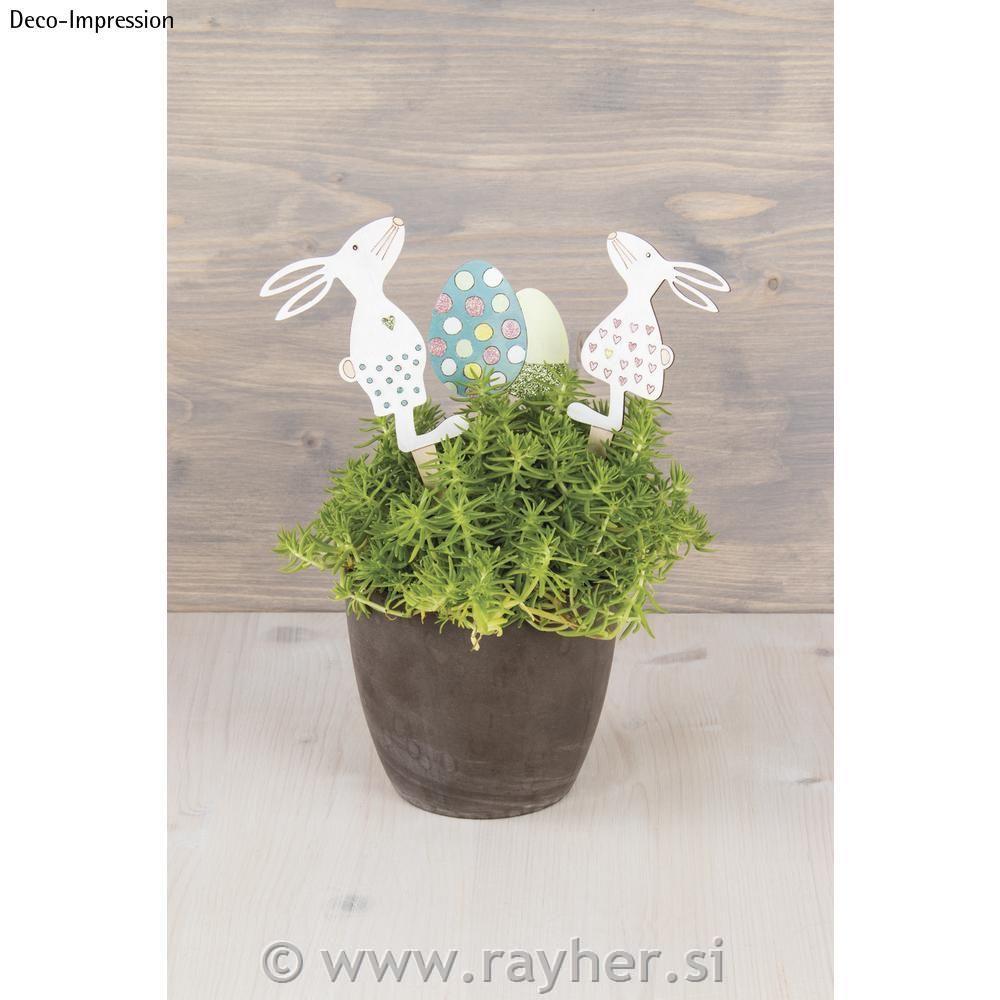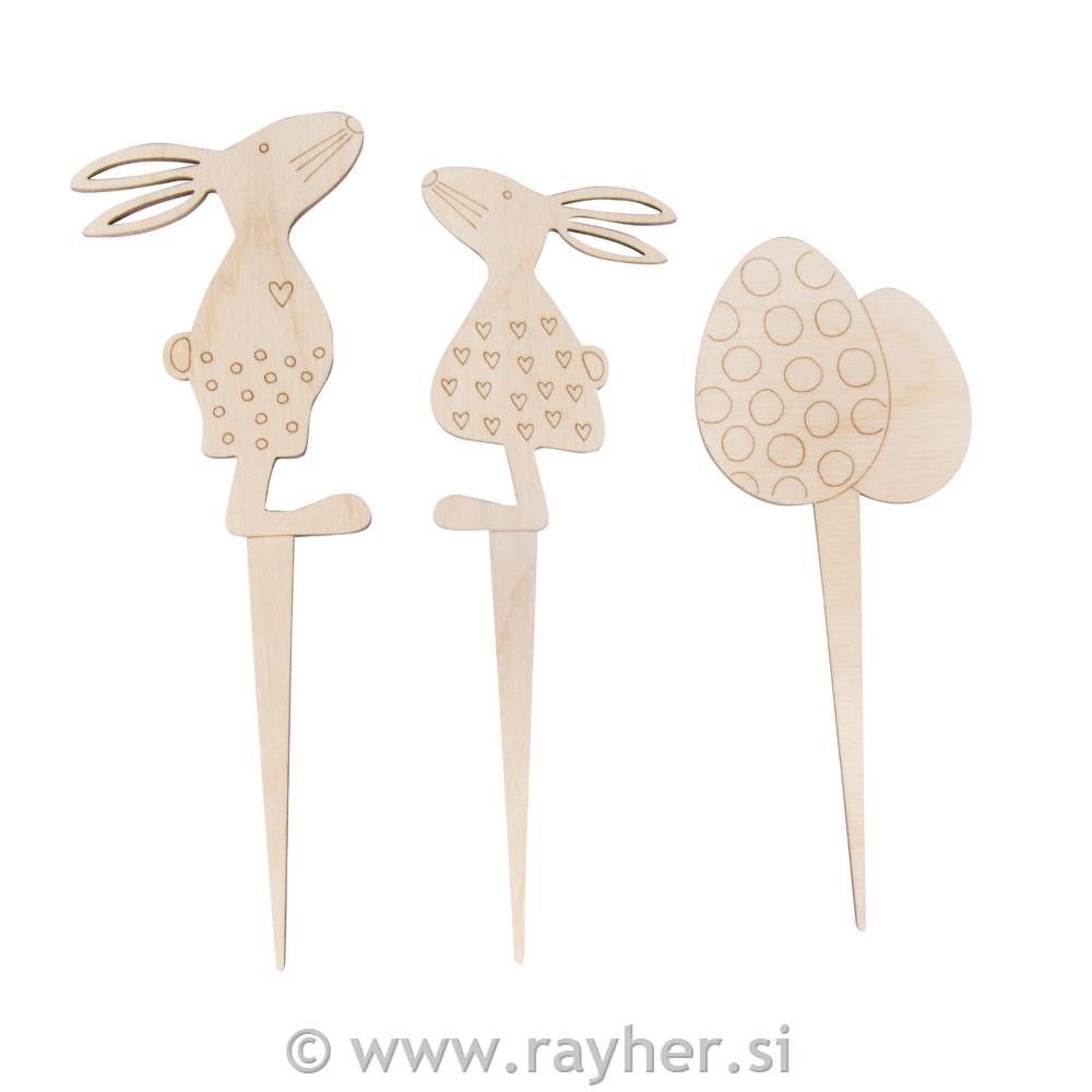 Čas za pomladno velikonočno krasitev. Tri naravne lesene palčke z vzorcem na sprednji strani ( dva zajčka in jajčka) vabijo k slikanju in dekoriranju.