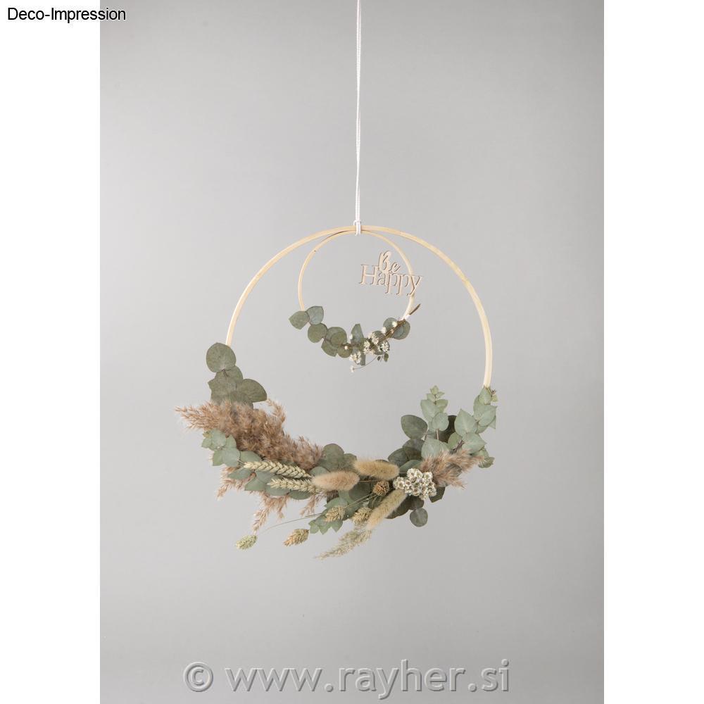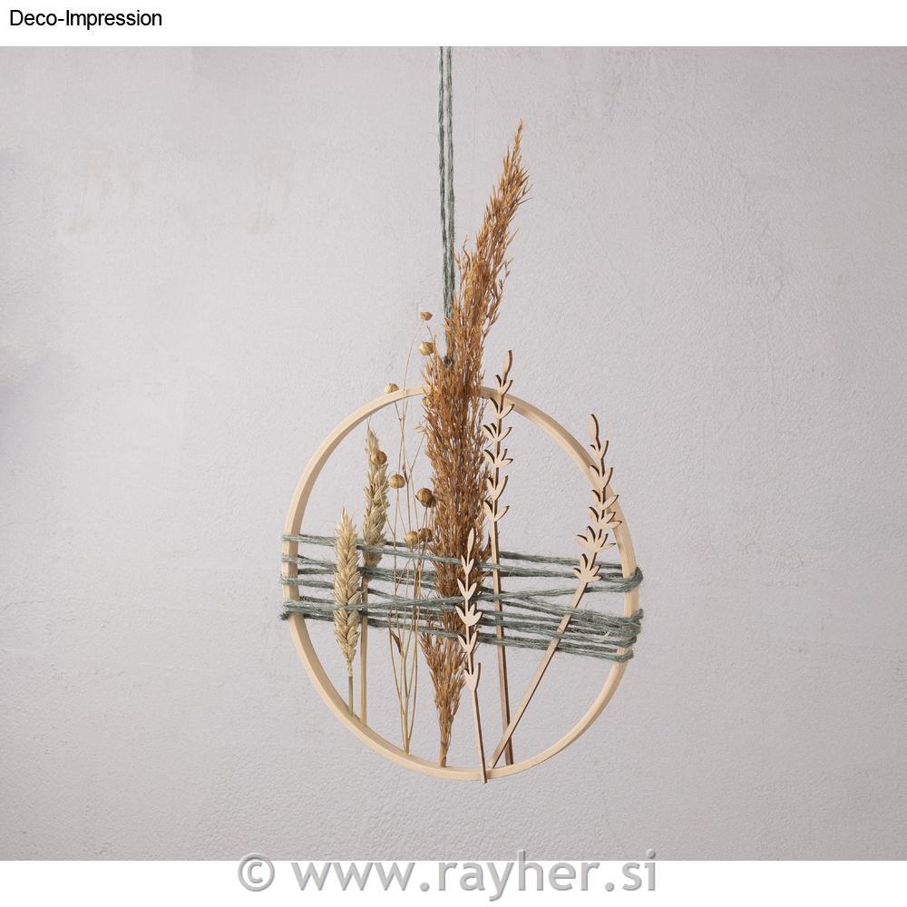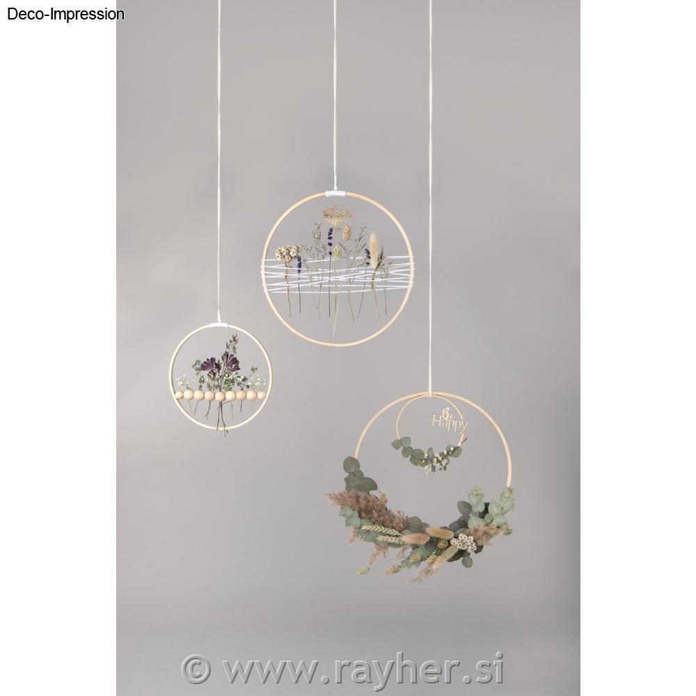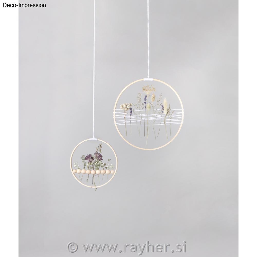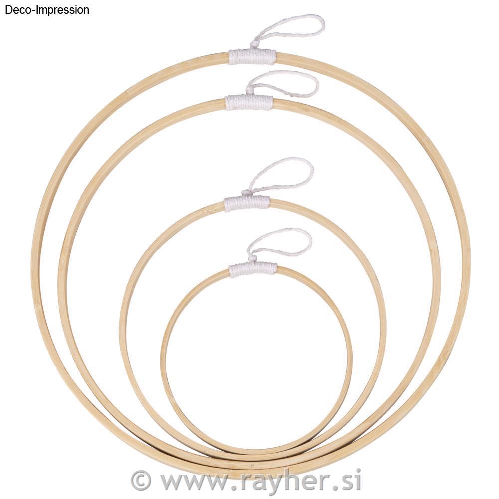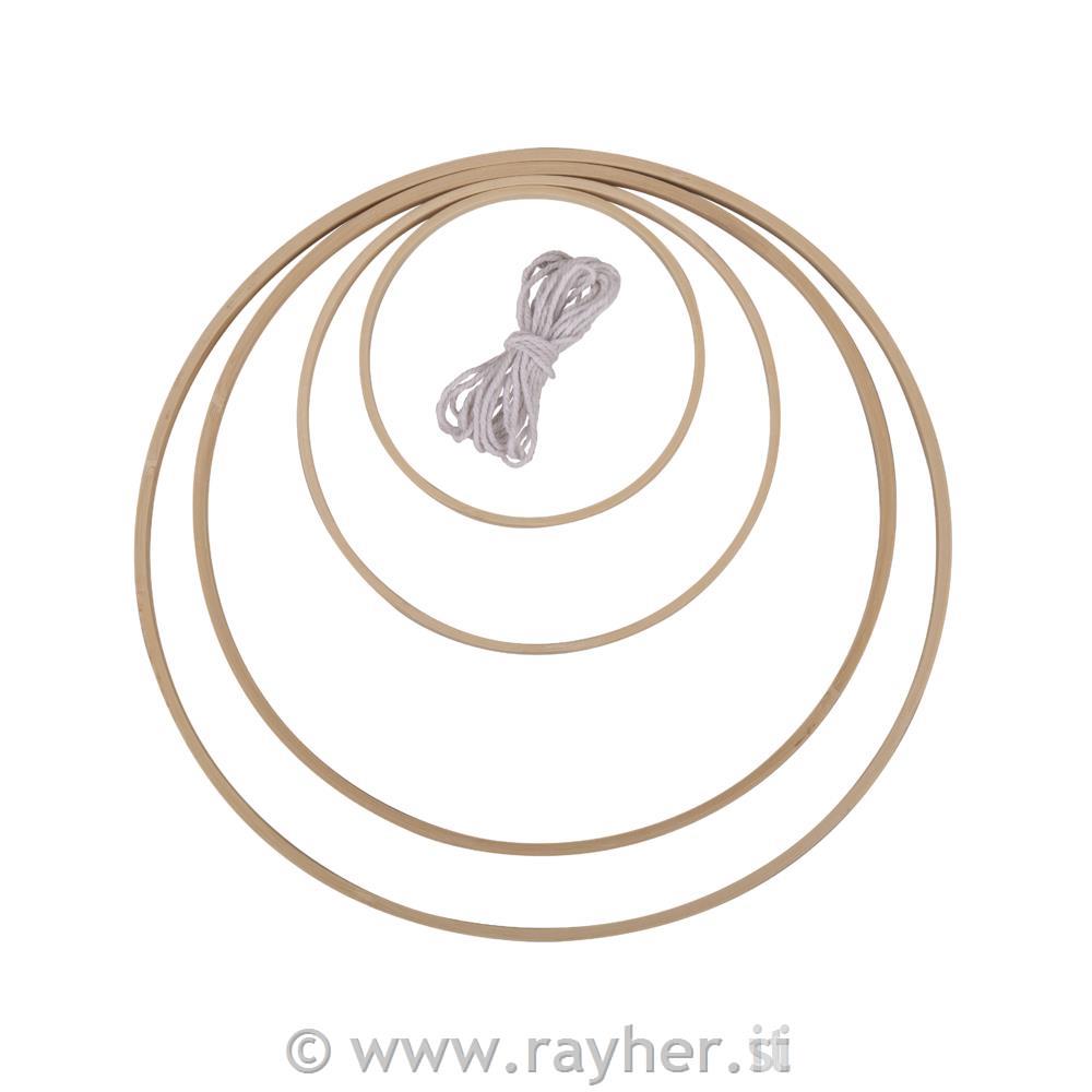 Vsebina: 4 bambusovi leseni obroči premer: 12 cm, 18 cm, 26 cm, 30 cm, 3 m vrvice, bele barve (80 % bombaž, 20 % poliester)