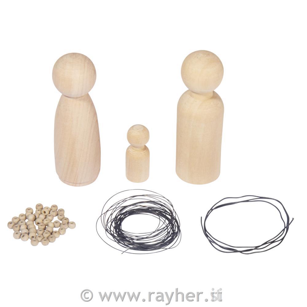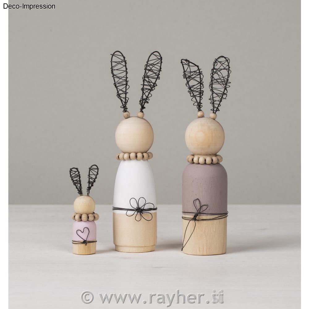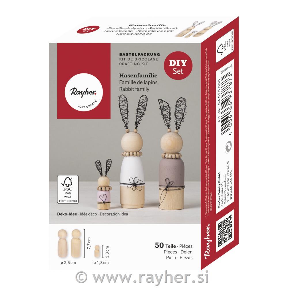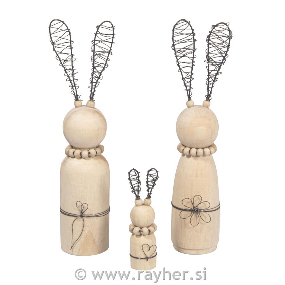 Vesela velika noč iz zajčje družine. Ustvarjalni set za čudovite velikonočne okraske. Trije posebni zajčki so izdelani iz lesa in žice.