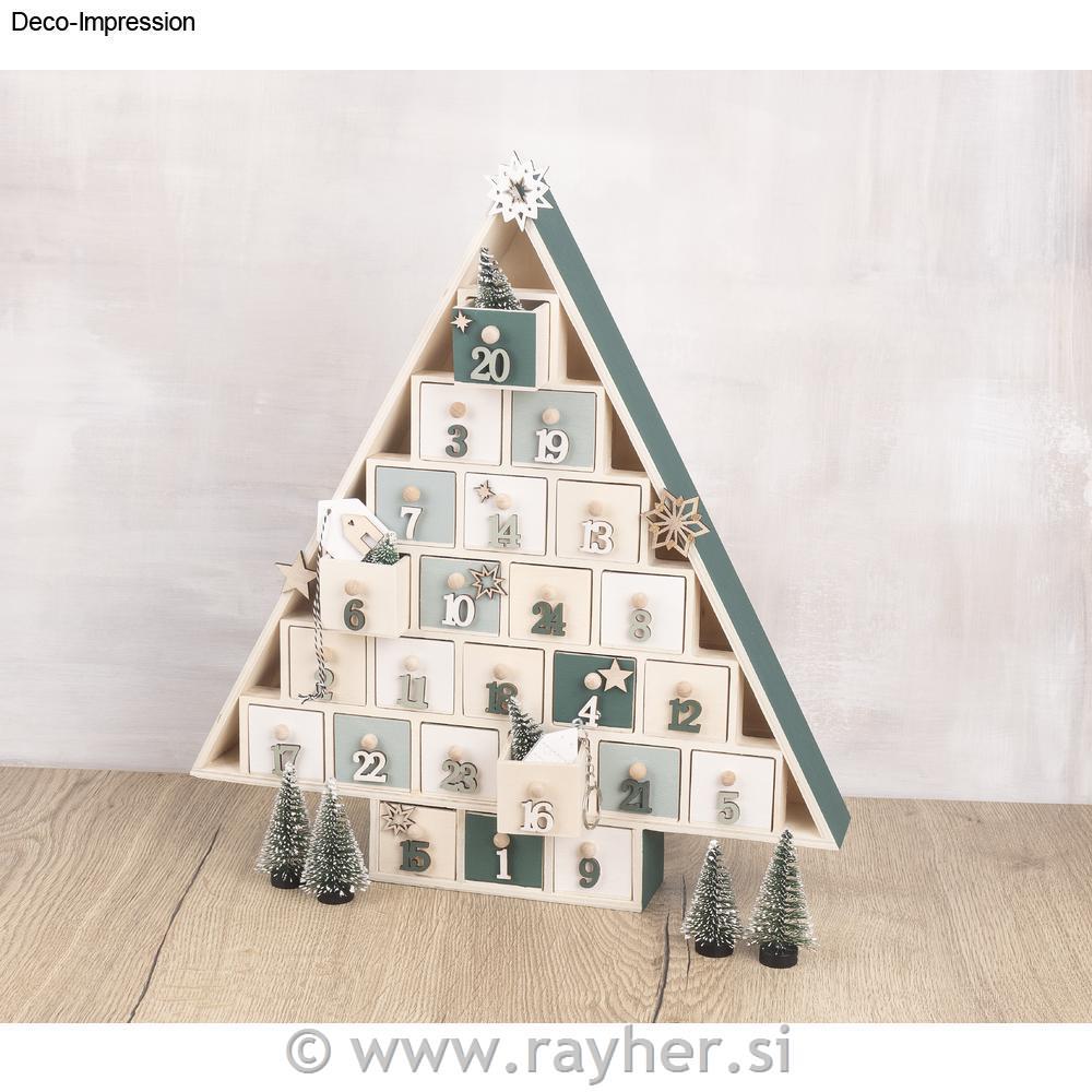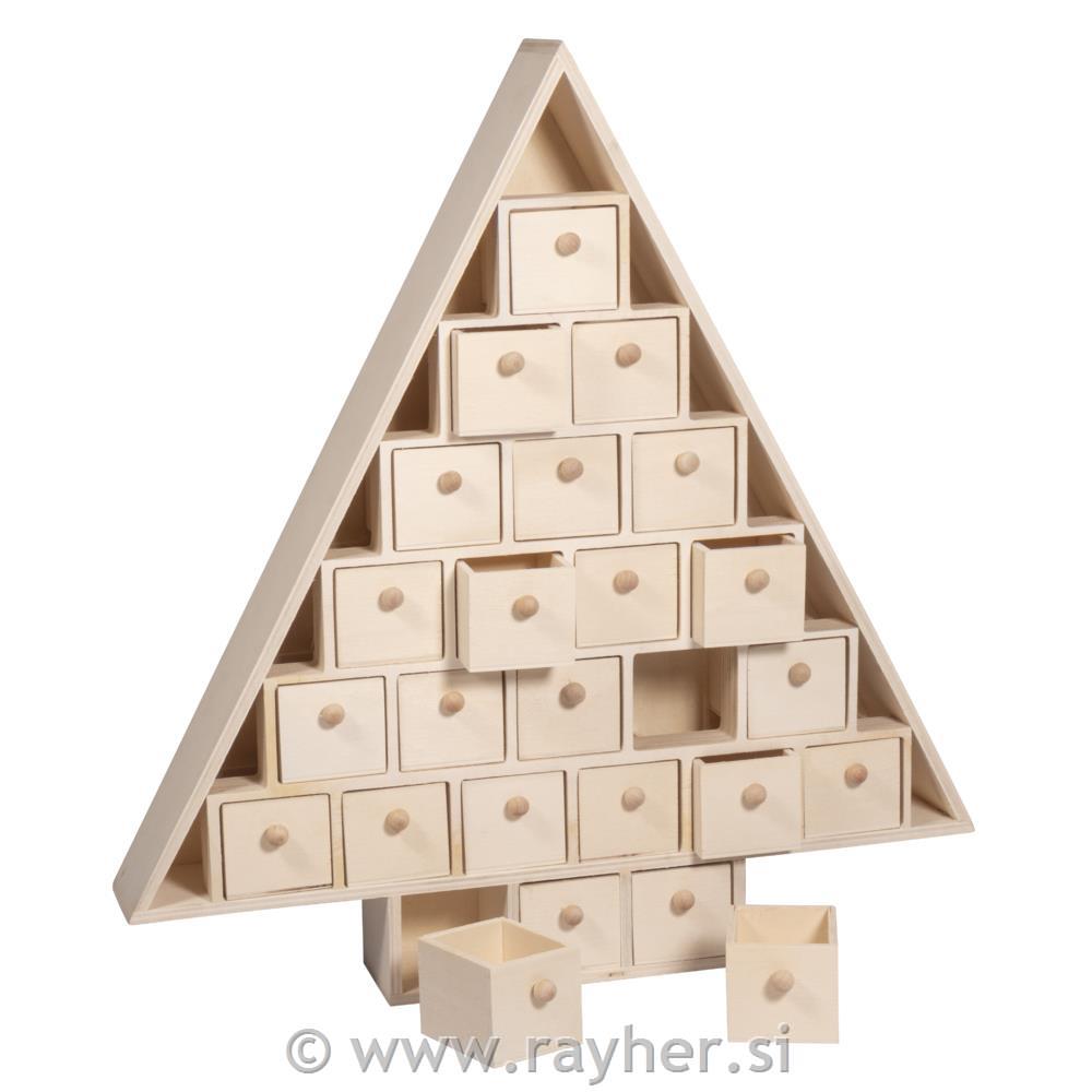 Adventni koledar v obliki drevesa iz lesa, dimenzije: 38,5 x 40,5 x 5,5 cm, s 24 predelki dimenzij 4,5 x 4 x 5,2 cm.