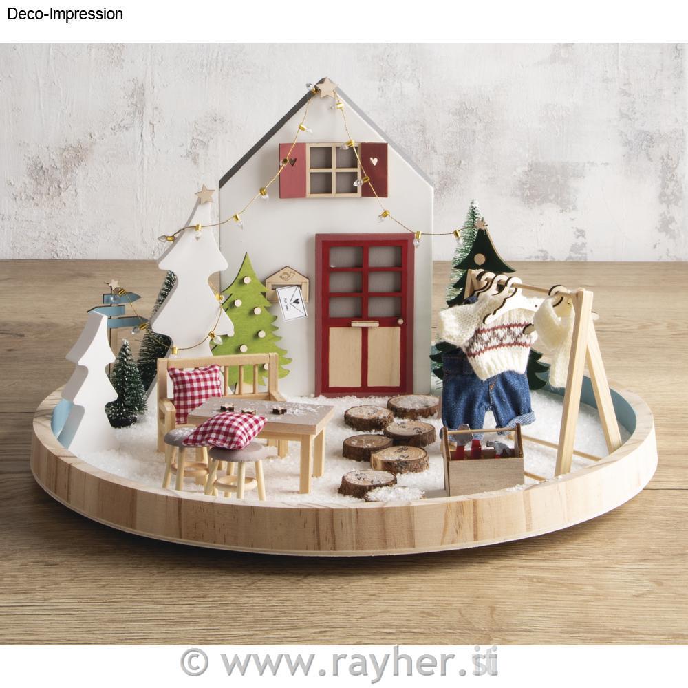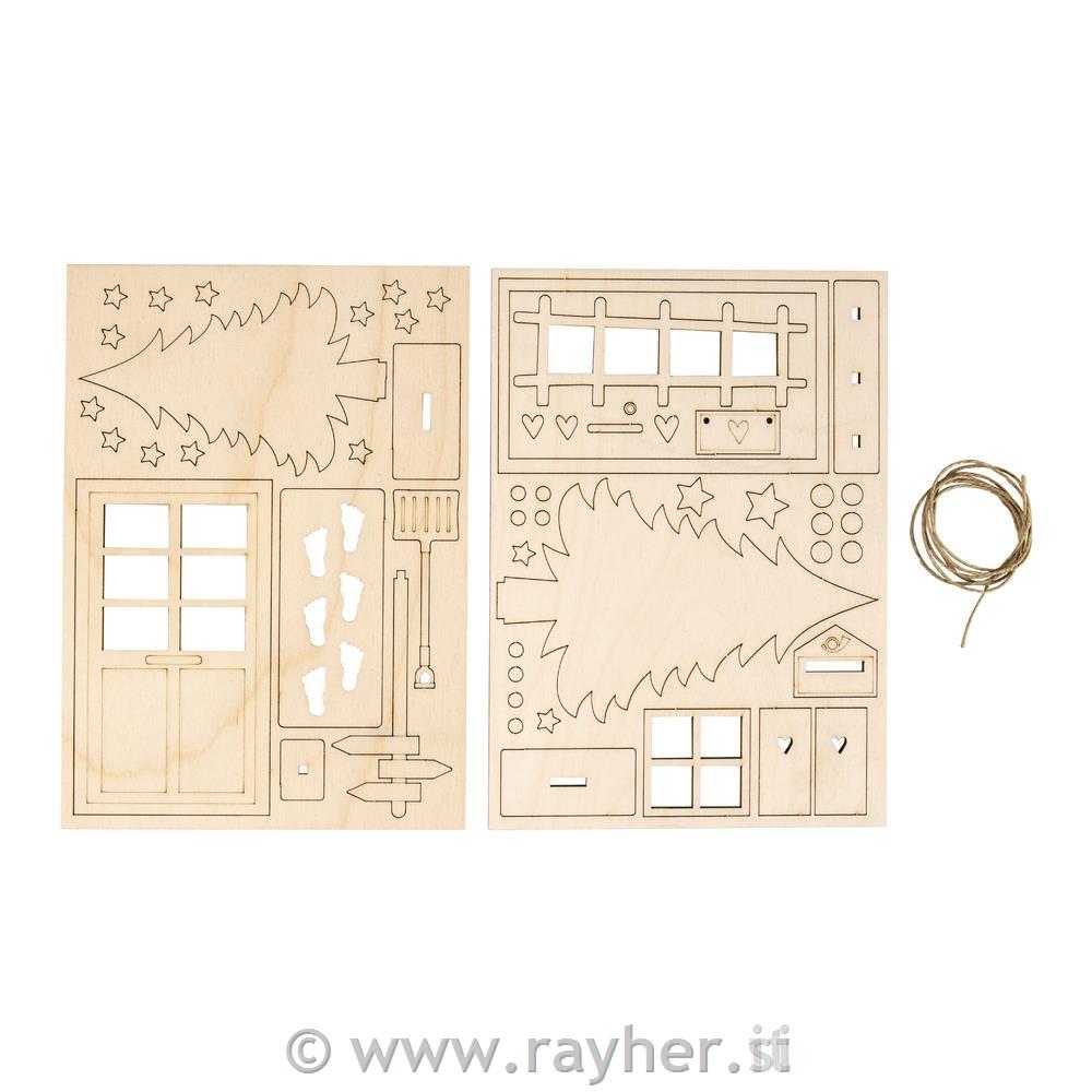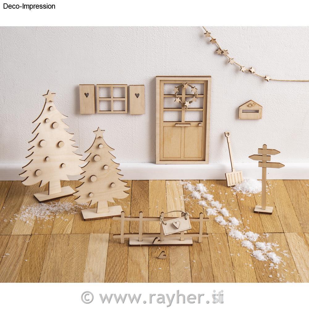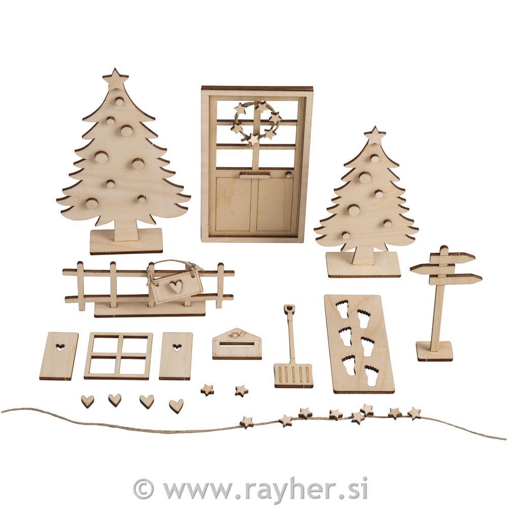 Izreži lesene dele iz plošče, jih pobarvaj, prilepi oziroma okrasi, na primer v okvir, na leseno ploščo … zagotovo ti bodo padle še druge ideje na pamet. Smrečice, smerokazi in ograja imajo stojala, zato jih lahko postaviš in okrasiš samostojno.