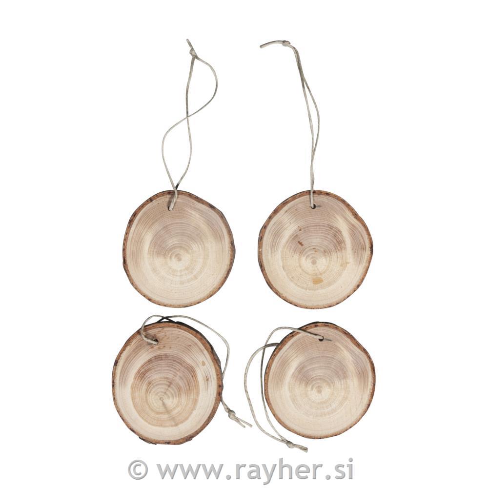 V paketu so štirje diski, dimenzije približno 6.5-7.5cm. Vsi diski imajo luknjo in juta vrvico, ki jo lahko uporabite za obešanje ali jo odrežete v kolikor je ne potrebujete. Za barvanje lesenih diskov priporočamo Rayher akrilne barve. V kolikor boste lesene diske uporabili v dekoracijah zunaj, priporočamo zaščitni akrilni lak Rayher.