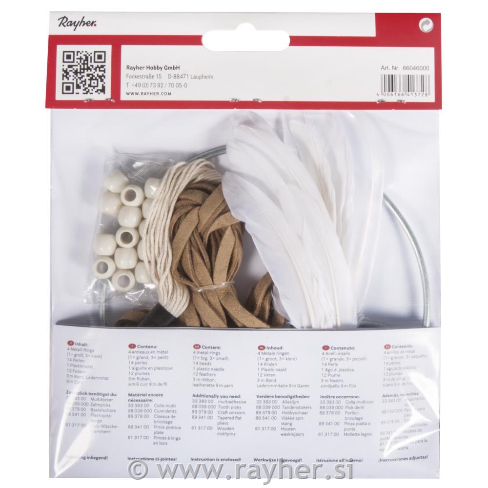 Vsebina kompleta: 4 kovinski obročki (1x veliki, 3x majhni) 14 lesenih perlic 1 plastična igla 12 perje 3m trak, 9m sukanec