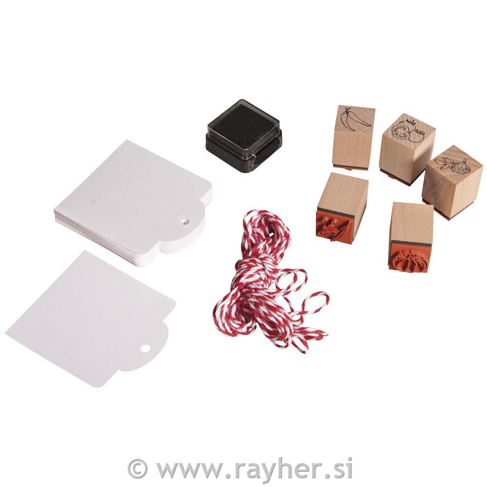 Poleg štampiljk je v setu še rdeče-bela vrvica 5m, črna blazinica za štampiljke, in 20 etiket velikost 5x7cm