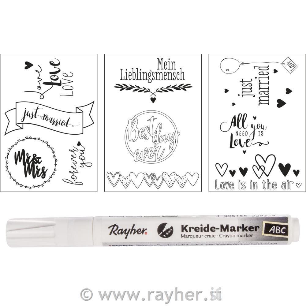 Hitro, enostavno in dekorativno pobarvajte okna, steklo in prosojne površine ter v kratkem času pričarajte odlične okraske za praznične priložnosti, kot so poroke ali karkoli, kar je povezano z ljubeznijo. V kompletu so poleg belega flomastra s kredo še 3 liste šablon v formatu DIN A1 in velik izbor različnih motivov v različnih velikostih.
