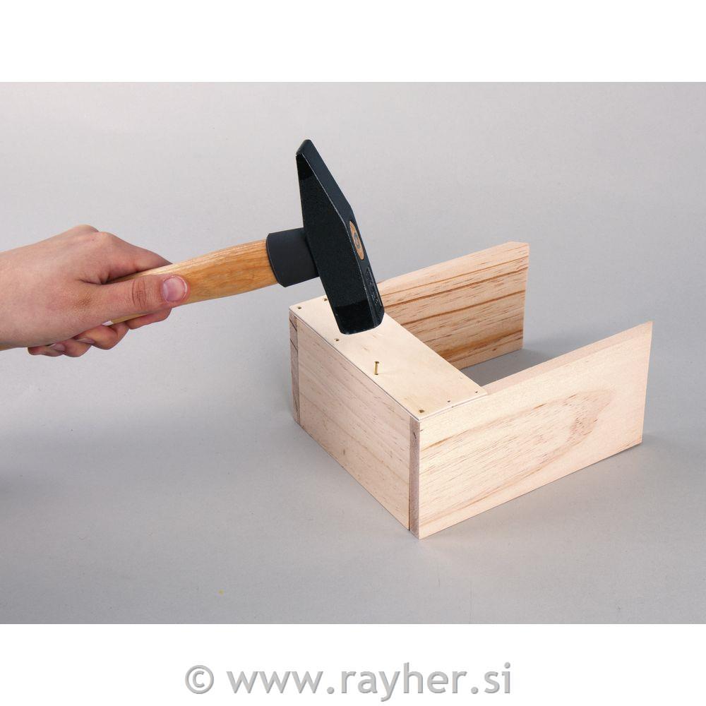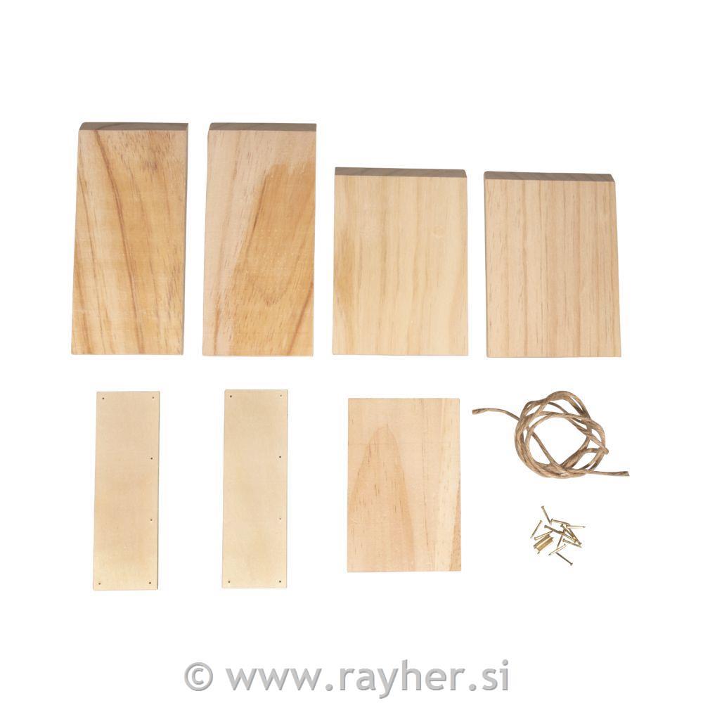Set vsebuje deščice za izdelavo krmilnice za ptice, žeblje in vrvico. Na zadnji strani embalaže najdete slikovna navodila kako krmilnico sestaviti.