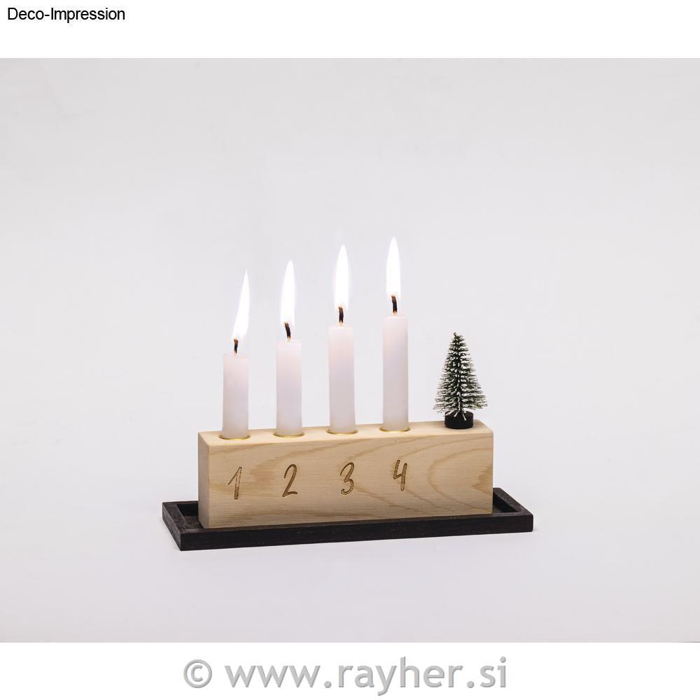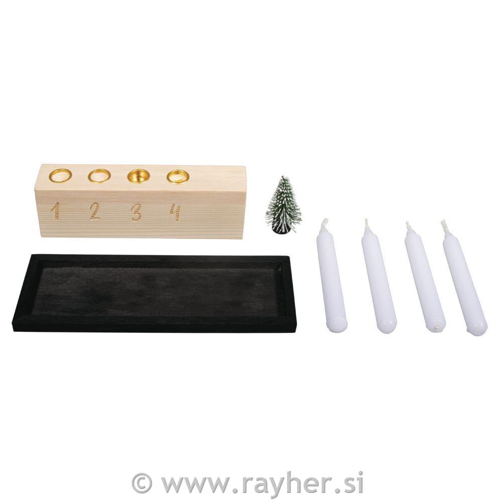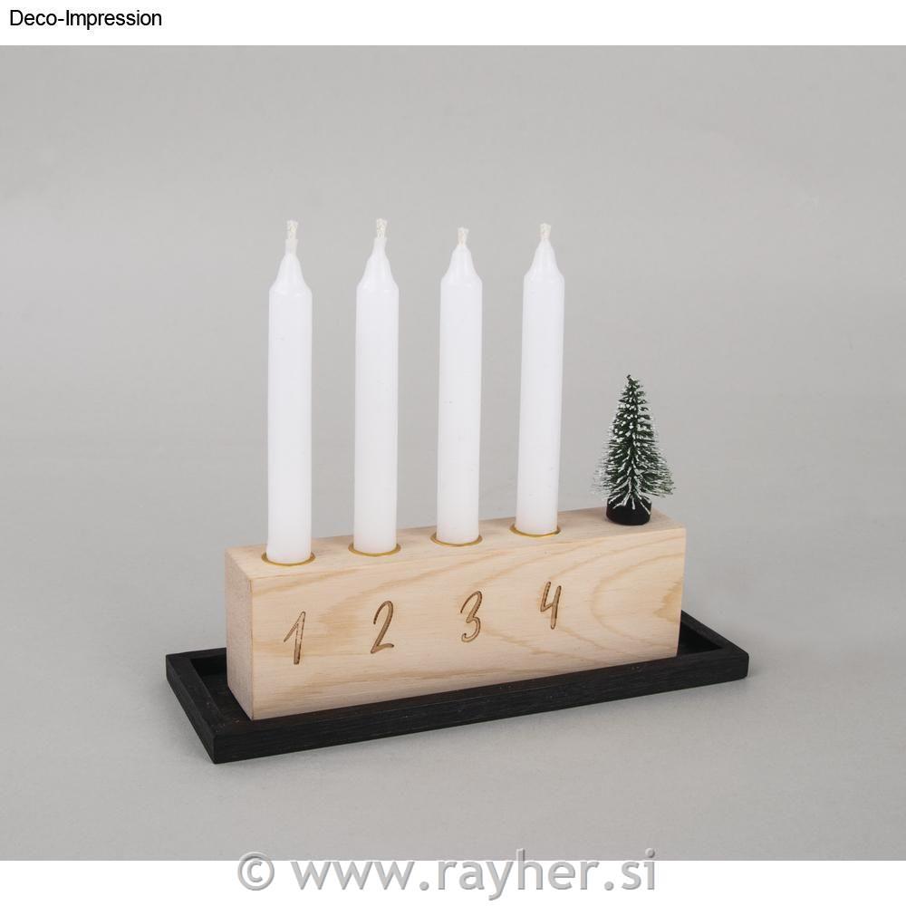 Vsebina: 1 lesen svečnik z medeninastimi držali za sveče in graviranimi številkami, 4 bele drevesne sveče (10,5 cm, 1 cm o), 1 črn lesen pladenj, 1 jelka.