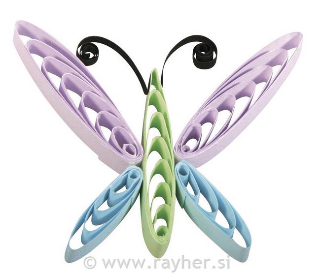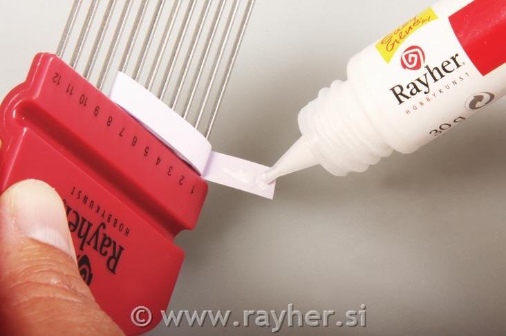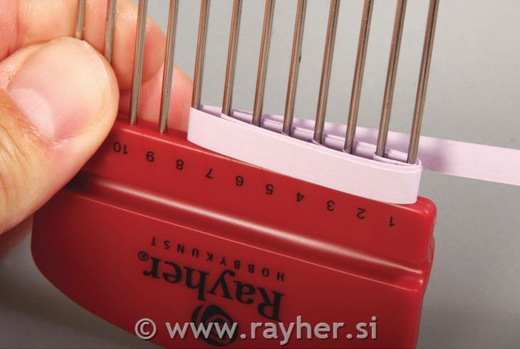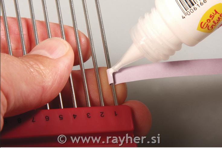 Papirnati trak ovijte okoli prvega kraka in ga pritrdite z lepilom za papir. Nato trak napeljite okoli posameznih zobcev, saj je zaradi oštevilčenja zobcev glavnika lažje enakomerno oblikovati elemente quillinga. Konec ponovno zlepite z lepilom za papir. Glavnik za quilling meri 10,5x6,5 cm in ima 12 zobcev z napisi, ki so med seboj oddaljeni 0,3 cm.