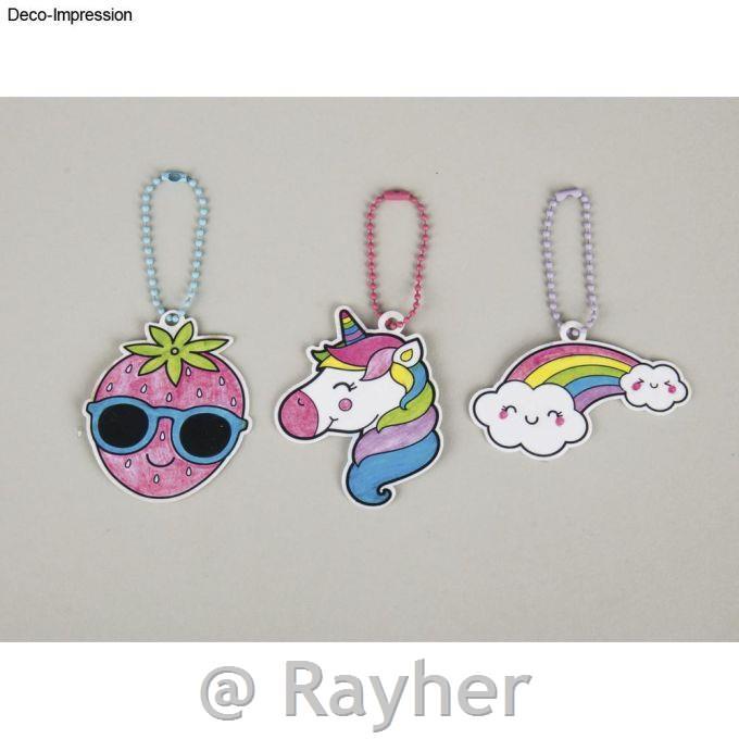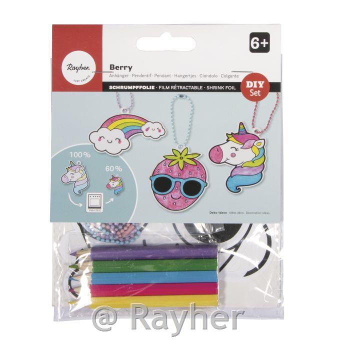 Paket DIY obeski iz skrčljive folije vsebuje ves potreben material za izdelavo treh ustvarjalnih obeskov. Preprosto ustvarjalno pobarvajte motive, jih pecite v pečici, da se skrčijo, in jih obesite na kovinsko verižico.