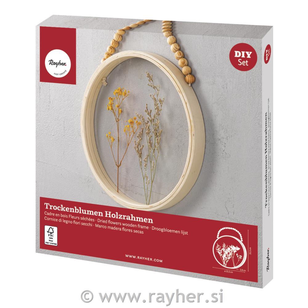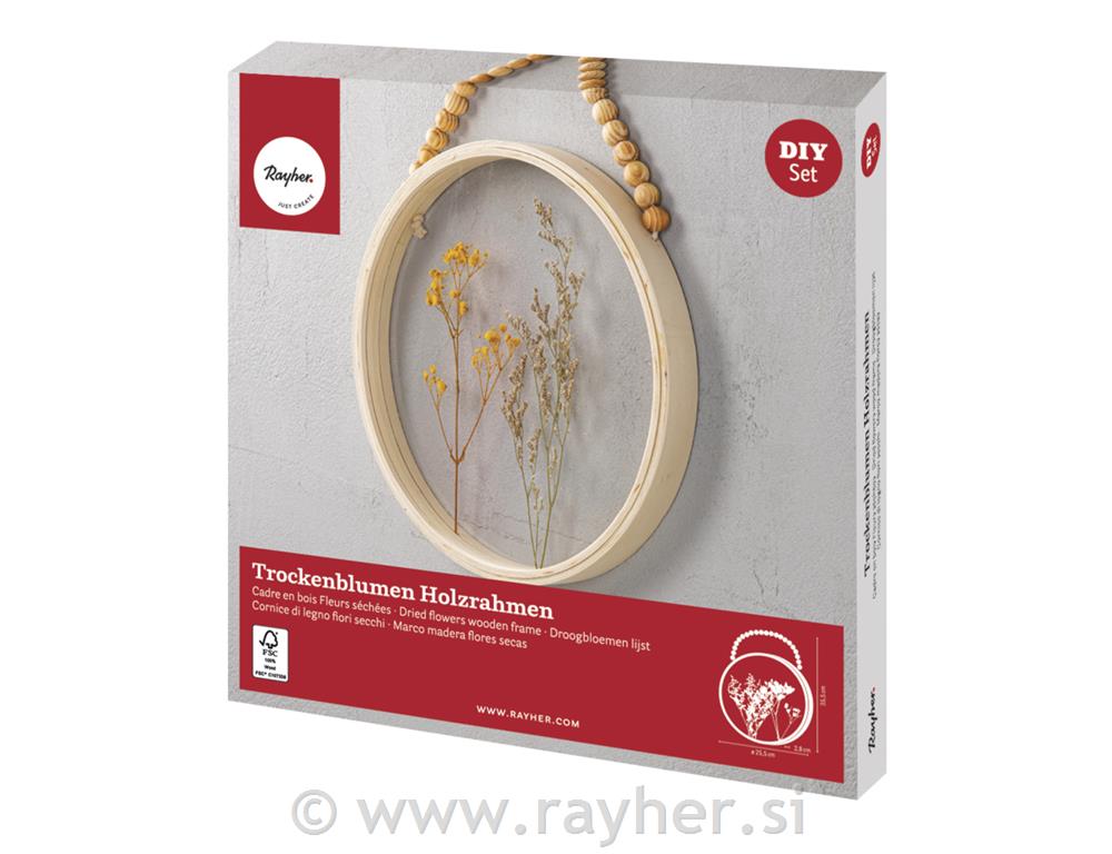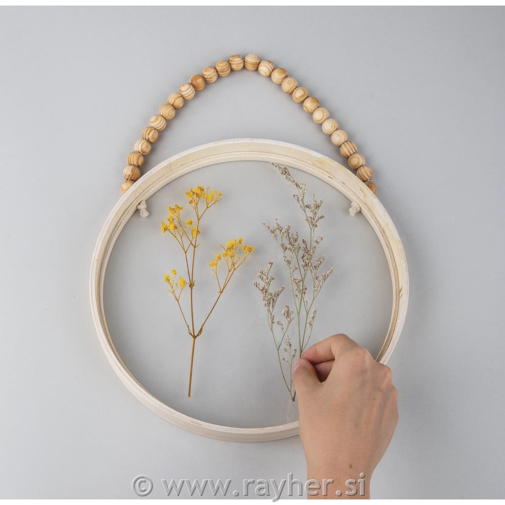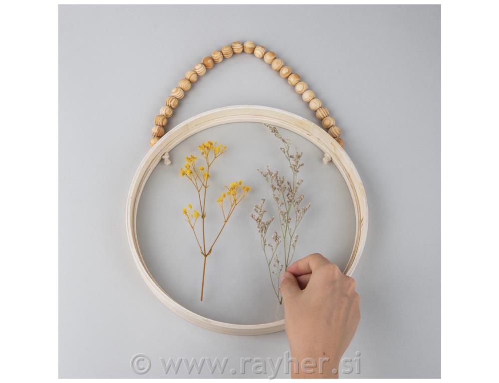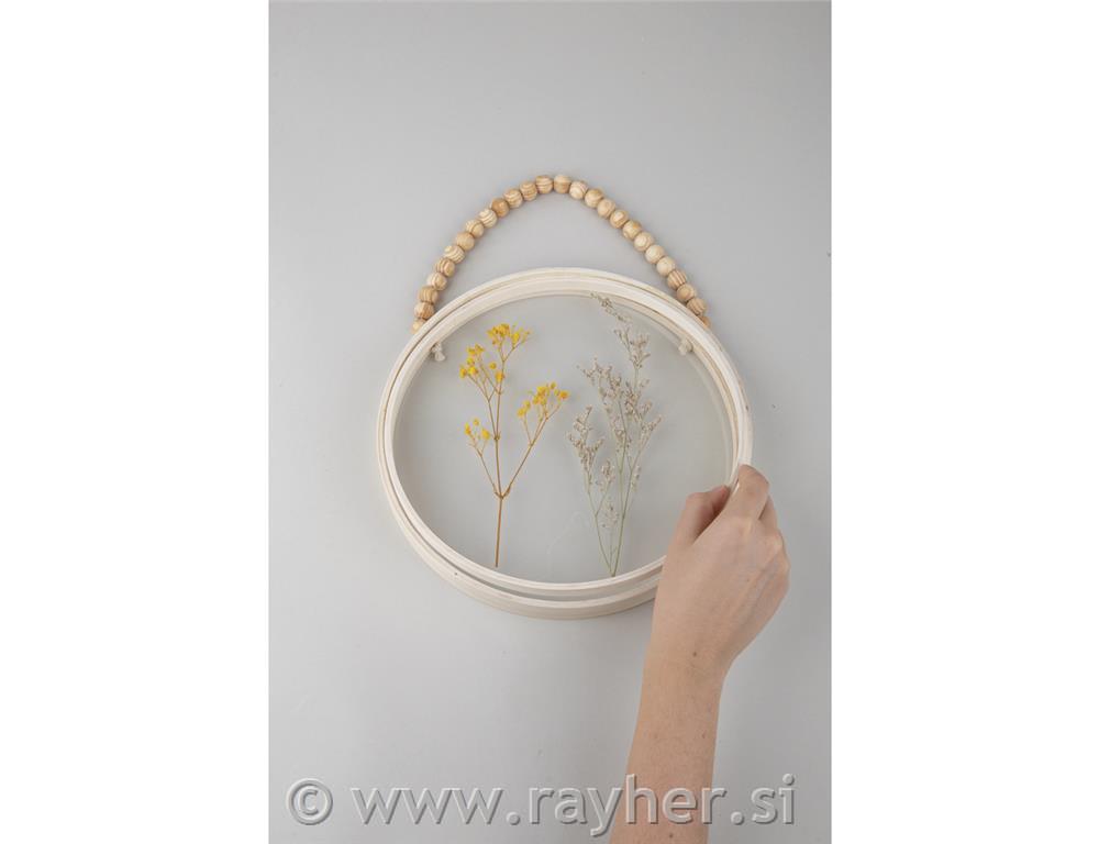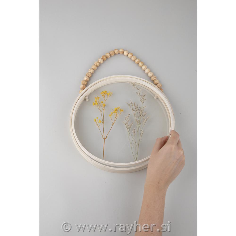 Set vsebuje 1x lesen okvir premera 25,5 cm, 2x prosojni plošči iz tanjšega pleksi stekla, obešanka vrvica za okvir, lesene perle ter posušeno cvetje.
