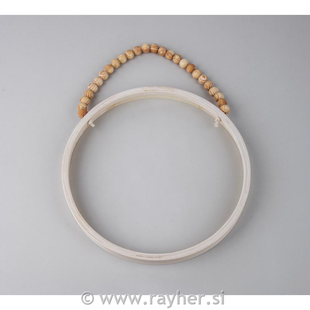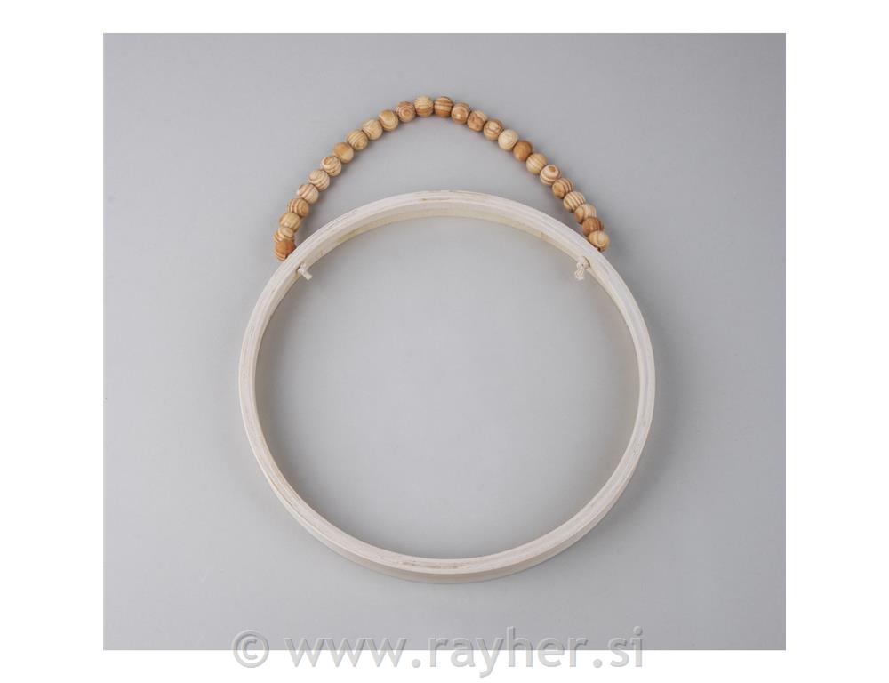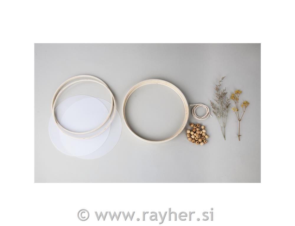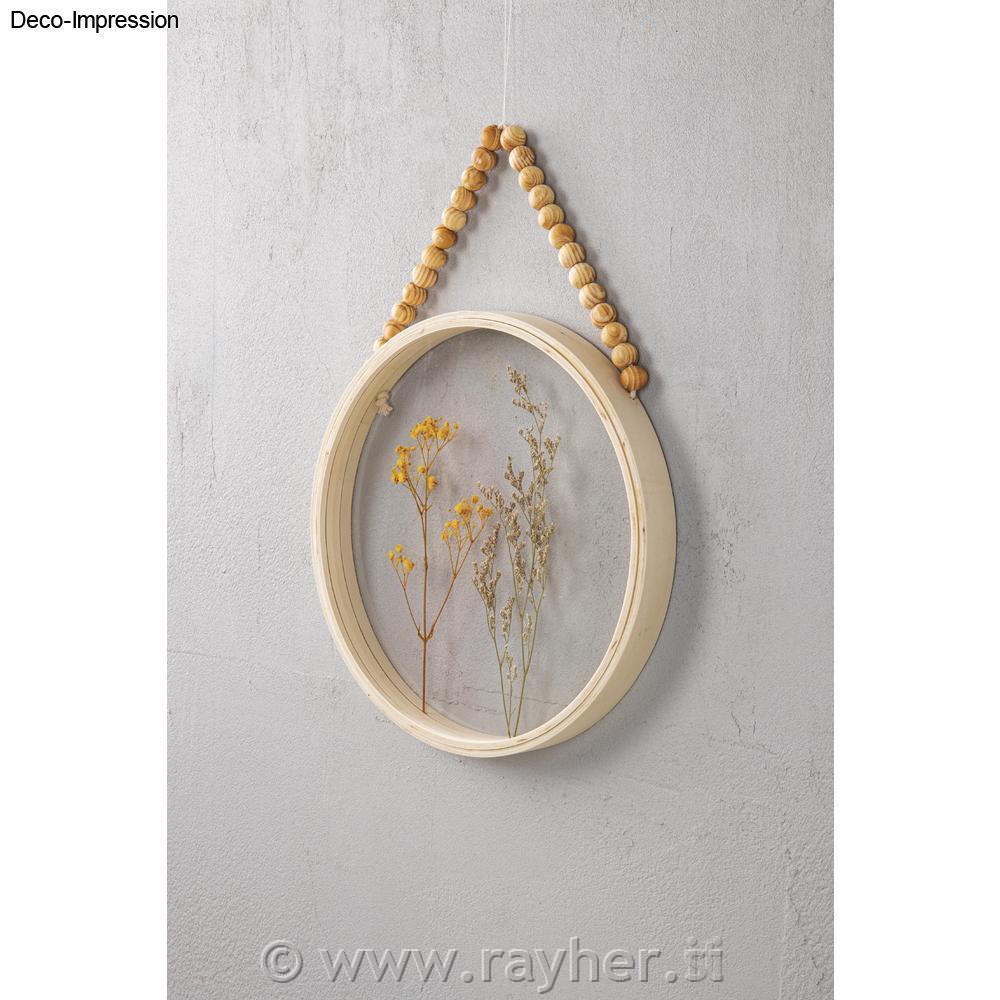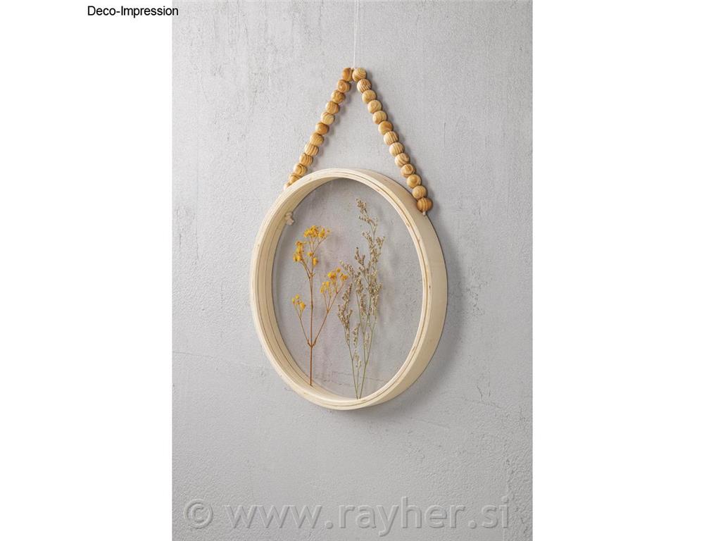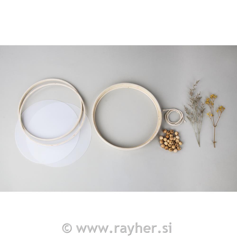 Set vsebuje 1x lesen okvir premera 25,5 cm, 2x prosojni plošči iz tanjšega pleksi stekla, obešanka vrvica za okvir, lesene perle ter posušeno cvetje.