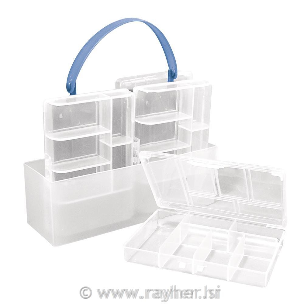 Štiri manjše škatle za sortiranje v praktičnem pladnju. Škatla za prenašanje z ročajem 18x18x6 cm Mere sortirnice 8x12x2,3 cm Škatla za sortiranje ima 6 predelkov, notranje dimenzije so 1 x 7,8x2,7x2 cm 2 x 4x2,4x2 cm 3 x 5x2,7x2 cm Idealen način za shranjevanje majhnih dodatkov. V škatli za sortiranje je dovolj prostora za perlice, okraske, delce za nakite, cofke in še marsikaj. Z enim ročajem imate vse materiale pri roki, škatla pa je odlična tudi za prenašanje. Vsaka škatla ima pokrov za zapiranje z loputo in je nameščena pokončno v nosilcu. Tako lahko na prvi pogled vidite vsebino vsake škatle.