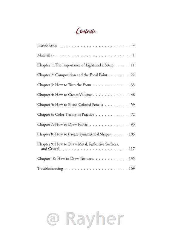 Demonstracije po korakih s fotografijami in navodili pojasnjujejo številne podrobnosti, ki preprosto kompozicijo oživijo. Winters strokovno obravnava tehnike, kot so senčenje, mešanje, teorija barv, risanje tekstur in tkanin, osnovna anatomija za portretiranje in številne druge teme.
