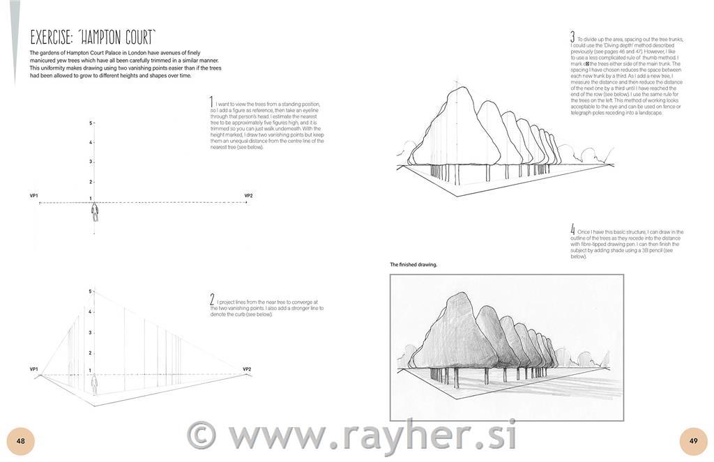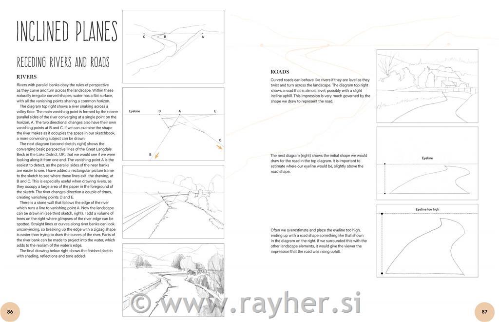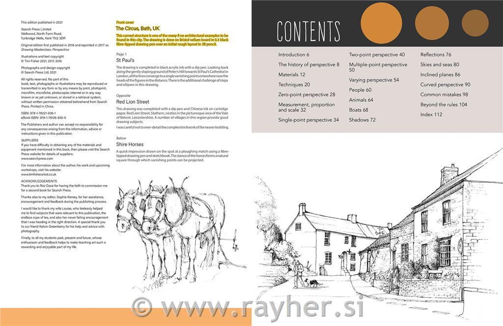 V knjigi je raziskanih nešteto tem, vključno s stavbami, pokrajinami, ljudmi, živalmi, čolni in odsevi. Strokovni nasveti za risanje ukrivljenih predmetov in nagnjenih ravnin, pregled pogostih napak in navdihujoče poglavje gledajo onkraj toge uporabe pravil za svobodno in instinktivno risanje vaših prizorov.