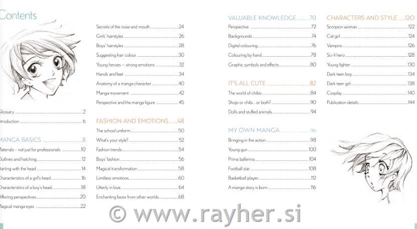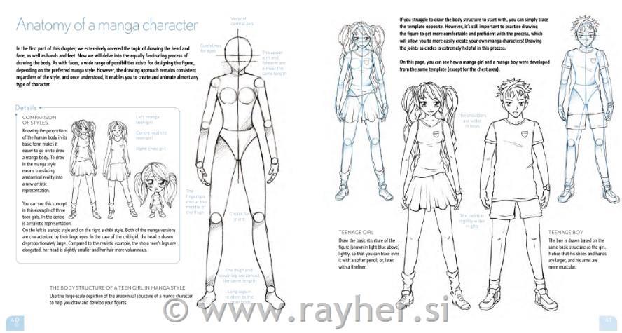 Anatomija likov mange se nato natančno raziskuje, od stopnje do podrobnosti, od zapletenosti obraznih potez za vsakega od različnih stilov mange do upodobitve rok in stopal, ki so izziv za mnoge umetnike. Keck razkrije svoje skrivnosti za prenašanje čustev in dinamike ter dodajanje globine likom s pričeskami in modnimi izbirami vse do mističnih ali fantastičnih podrobnosti, kot so živalska ušesa in celo repi! Vse te komponente skupaj pomagajo ambicioznim piscem grafičnih romanov, da svojim likom vdahnejo pristnost.