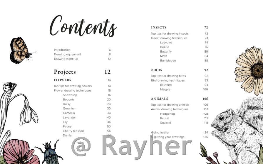 Poglobljene nasvete in tehnike v vsakem poglavju, od risanja natančnih robov cvetnih listov do ustvarjanja realističnega perja in krzna.