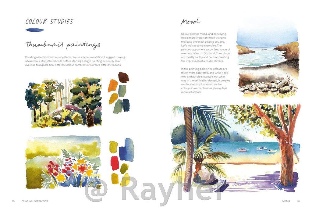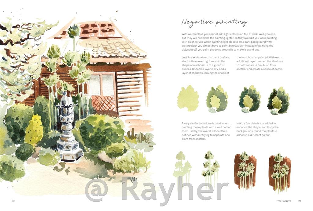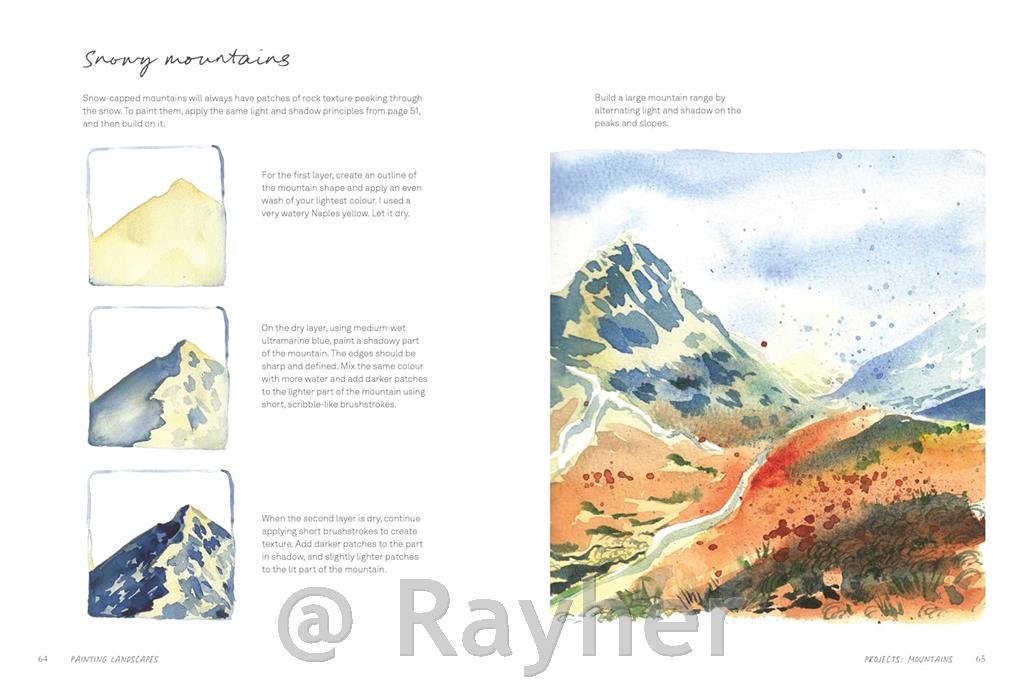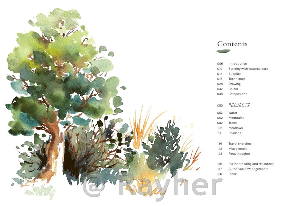 Z navodili po korakih Inga predstavi bistvene pripomočke, teorijo barv in tehnike, ki jih boste potrebovali za začetek, od pranj in glaziranja do ustvarjanja teksture s soljo, suhim čopičem ali maskirno tekočino. Nato vas vodi skozi navdihujoče projekte, ki raziskujejo širok spekter naravnih in potovalnih motivov, vključno z: