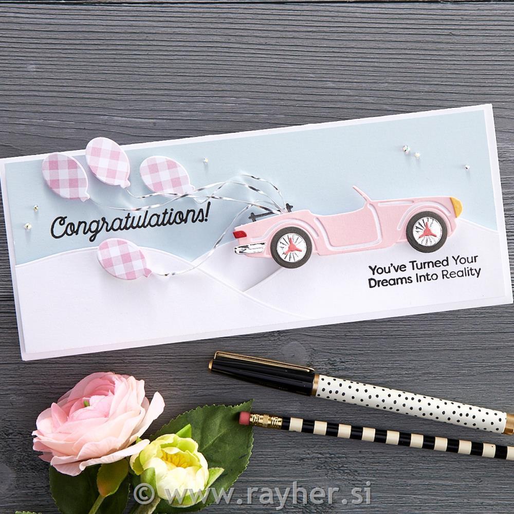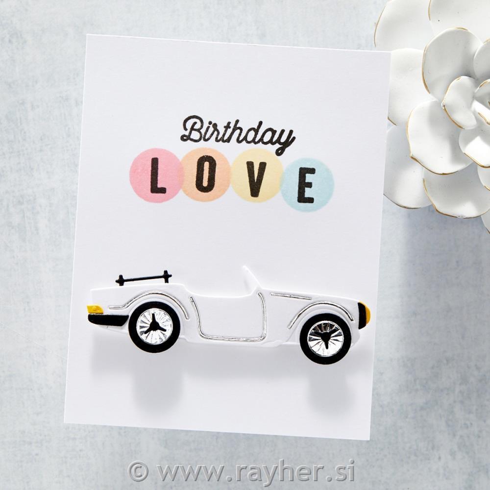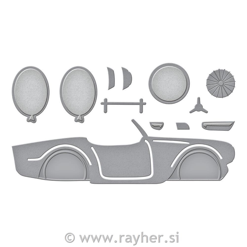 Komplet šestih tankih šablon ustvari stranski profil kabrioleta z veliko zabavnimi detajli. Vključuje tudi balone za praznični pridih!