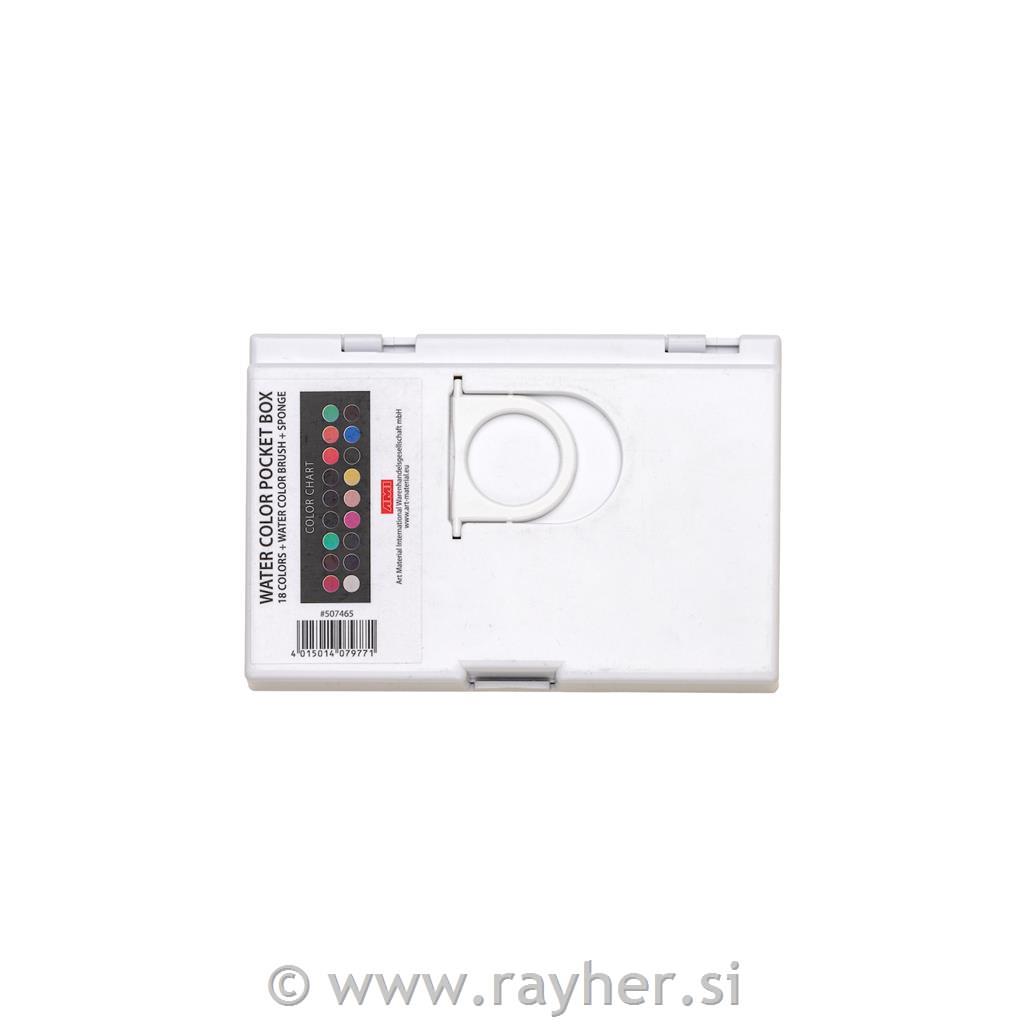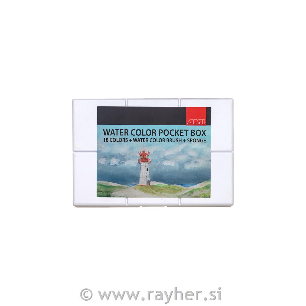 AMI Watercolor Pocket Box vsebuje 18 akvarelnih barv, čopič za vodo in gobico.