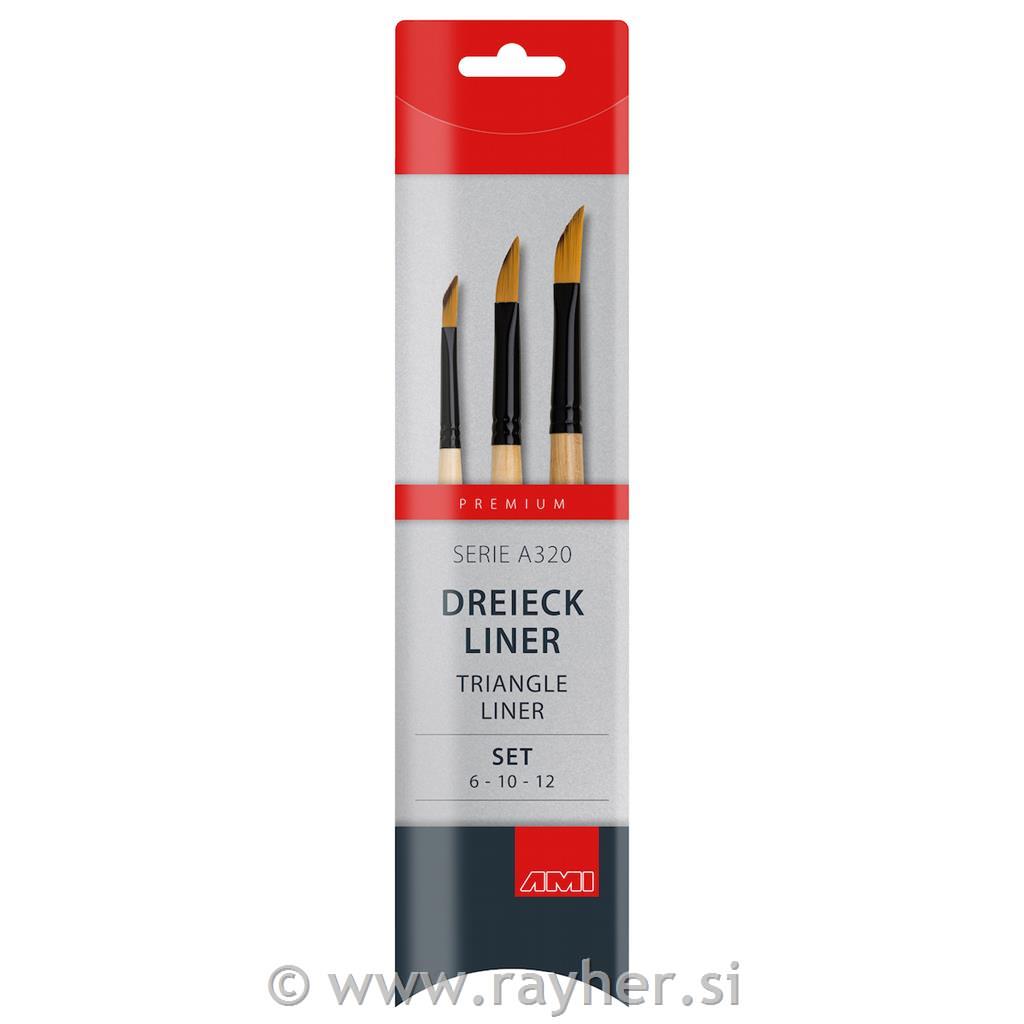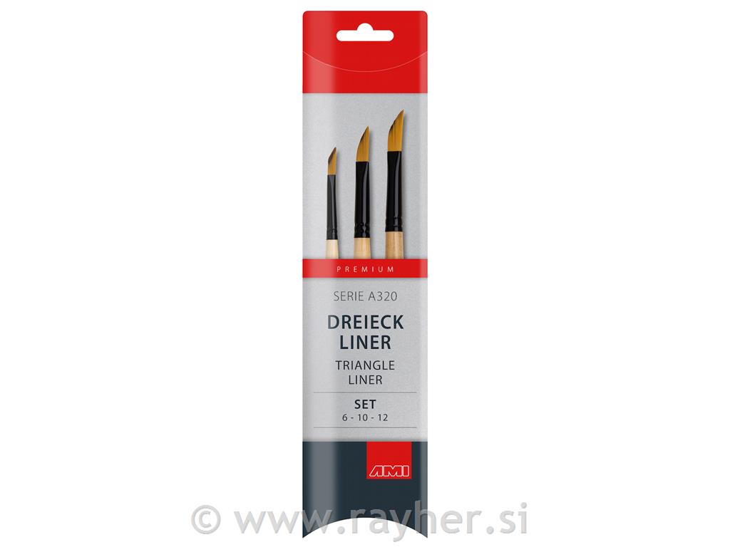 Čopiči tristrane oblike, ki se zaključi v brezhibno konico iz sintetičnih dlak. Poseben čopič namenjen uporabi tribarvnega sistema. Na vsako stran čopiča nanesite po eno barvo, ki se bodo na sliki različno pojavljale (slikanje večbarvnih trakov, listja, …) V setu so trije čopiči številke 6, 10 in 12.