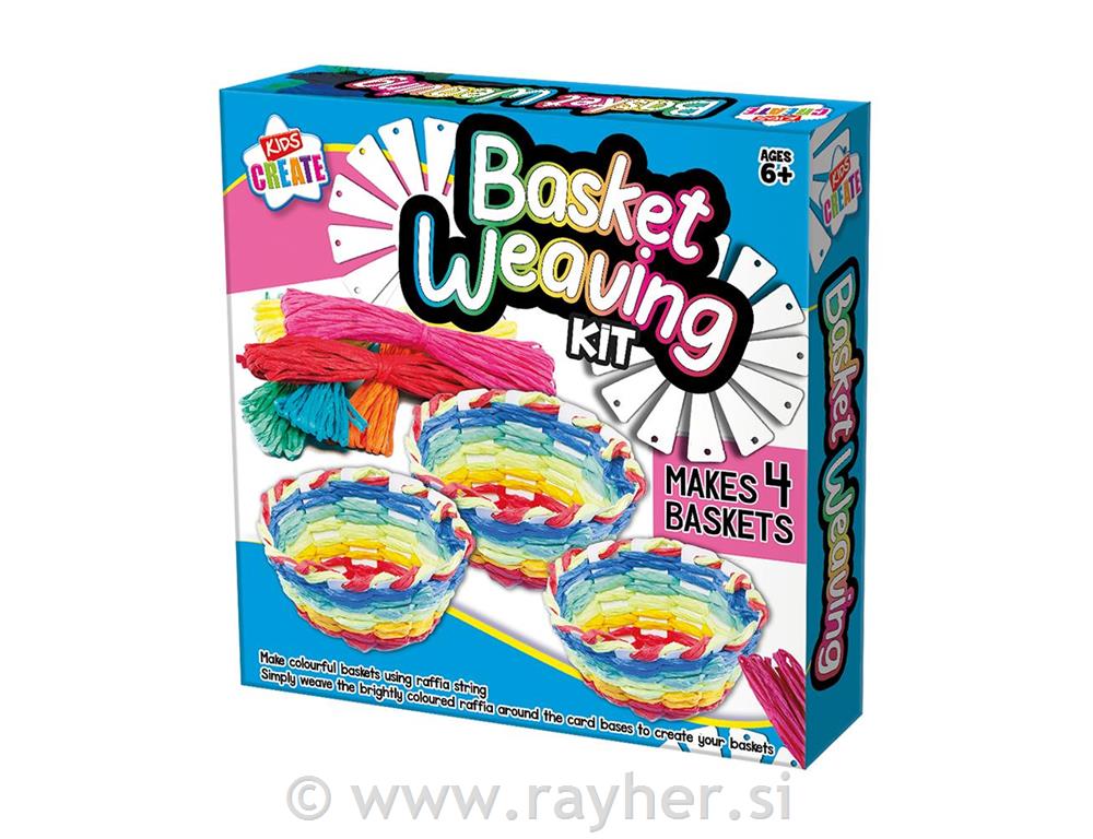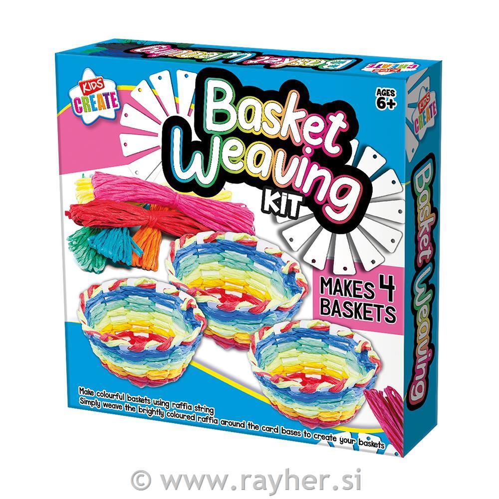 Set vsebuje štiri osnove za izdelavo košar, šest zavitkov barvne rafije