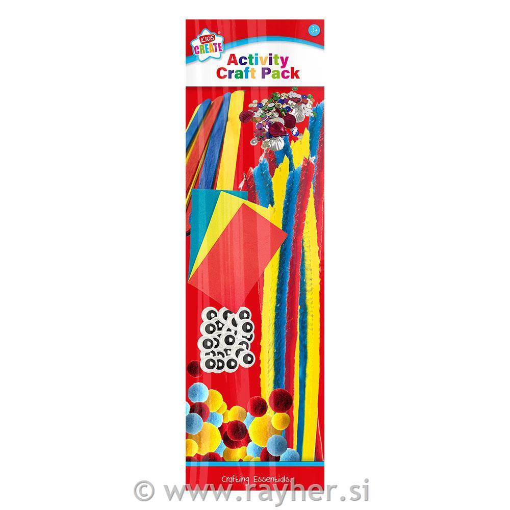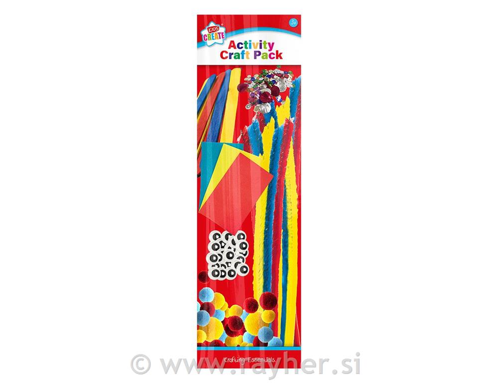 Set vsebuje: pompone, kosmate žičke, bleščeče dodatke, plastične oči, lesene paličice in penasto gumo