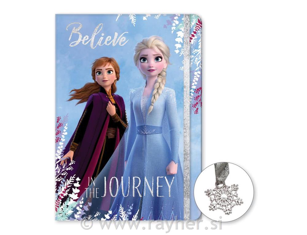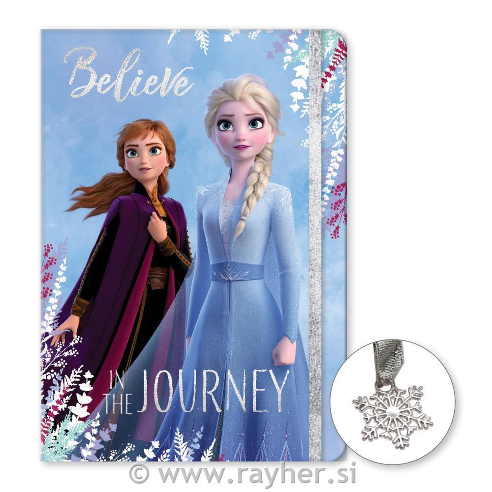 Notesnik, zvezek Frozen, Belive in you Journy A5, ima črtaste strani. Ob strani ima čudovit srebrn rob, platnice pa lahko zaprete s srebrno elastiko, ki ima na robu kovinsko snežinko.