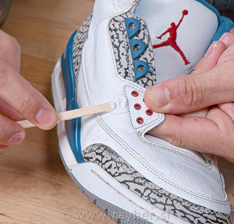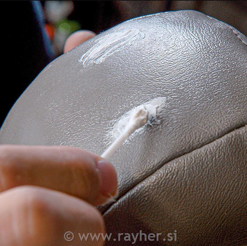 Za čiščenje območja uporabite Angelus Leather Preparer & Deglazer ali aceton. S tem odstranite umazanijo, olje ali premaz, da se polnilo lahko pravilno oprime.