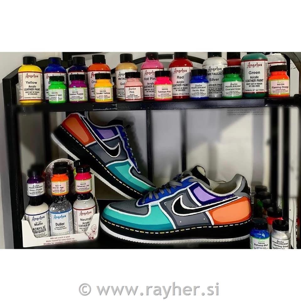 Barvo nanesite s tankim čopičem ali gobico. Če nanašate več nanosov pustite, da se med posameznimi nanosi barva dobro posuši. Ne sušite barve s sušilcem za lase. Na koncu nanesite enega od akrilnih lakov Angelus za zaščito barve pred odrgninami in praskami. Priporočamo, da pred barvanjem čevljev pripravite čevlje s Angelus Preparer and Deglaser (preparator in razmaščevalec). Barve Angelus so po sušenju sijajne. Če želite, da bodo imele mat izgled morate barvi dodati medij za mat videz Angelus Duller.