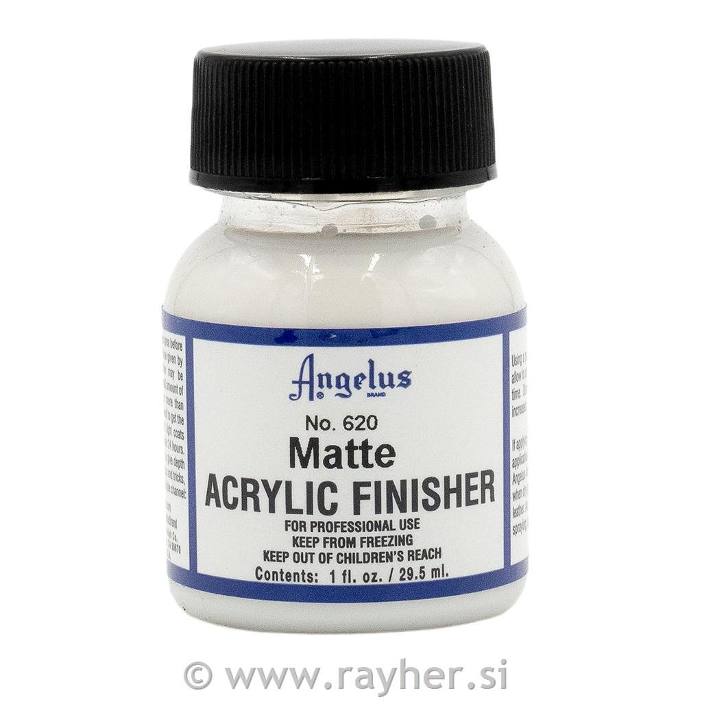 Angelus Finisher Mat, 29.5ml zaključni lak. Pred uporabo lak vedno temeljito pretresete. Upoštevajte, da lak Finisher Matt ni popolnoma mat - še vedno je opazen rahel sijaj. Če želite še manj sijaja, vam priporočamo, da dodate sredstvo Duller.