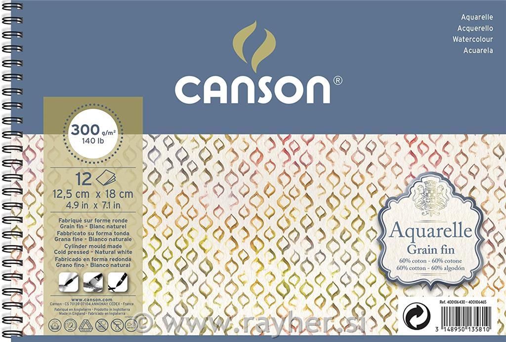 Blok akvarelni spirala Aquarelle Canson 12,5x18 cm 300 g, 12 listni; Cold Presse