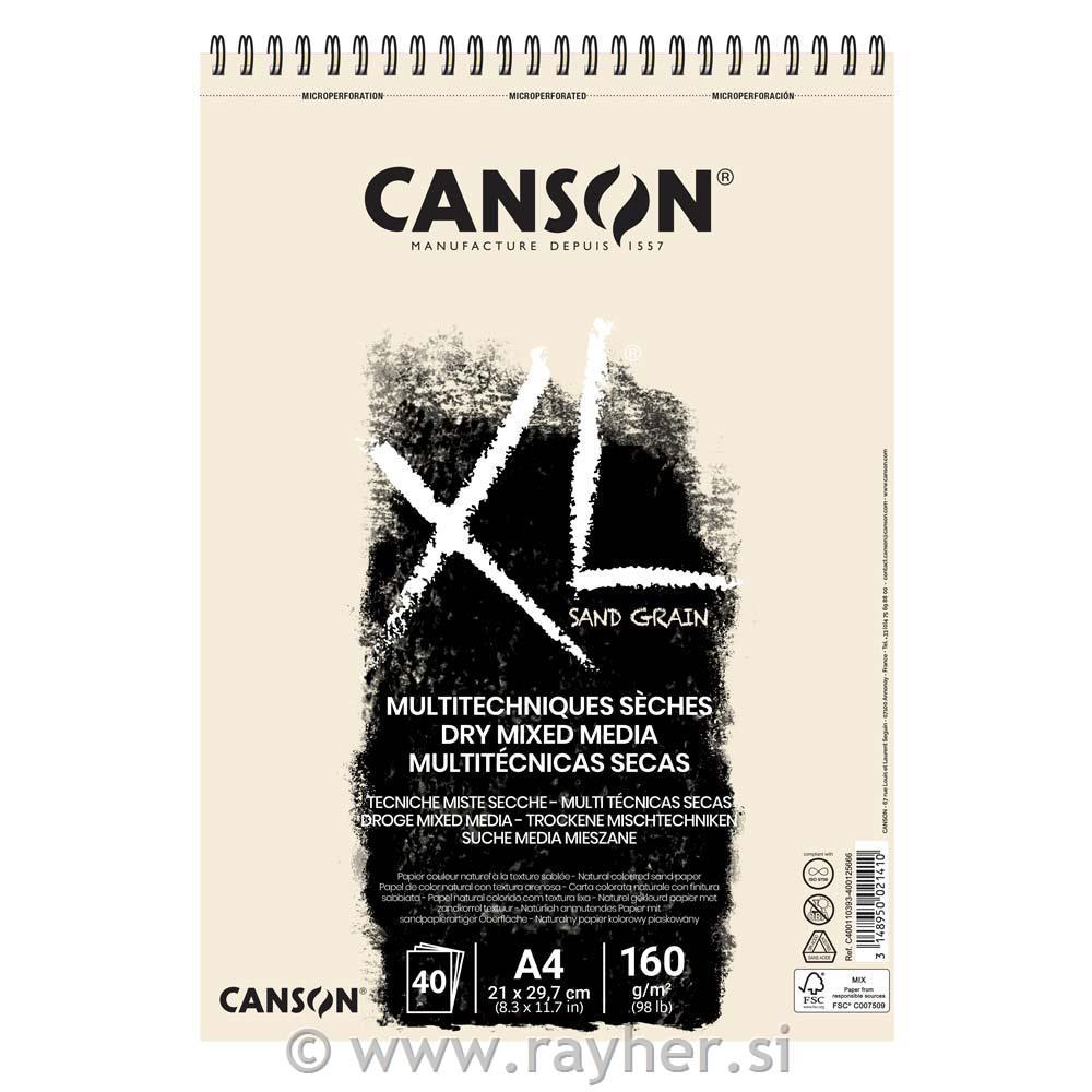 Papir Canson XL Sand Grain vsebuje organske, obnovljive materiale. Njegova površina zadrži pigmente, kar ustvarja subtilne barvne učinke. Enostavno se briše in se lahko uporablja na obeh straneh. Zasnovan je posebej za medije, kot so svinčnik, pastel ali oglje.