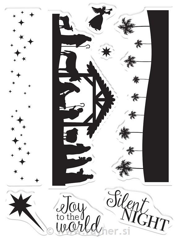 V setu je 8 polimernih (prosojnih) štampiljk na temo svete družine. Dimenzije 15.7x21.1cm. Dodana sta napisa v angleškem jeziku "Joy to the World' in "Silent Night'.