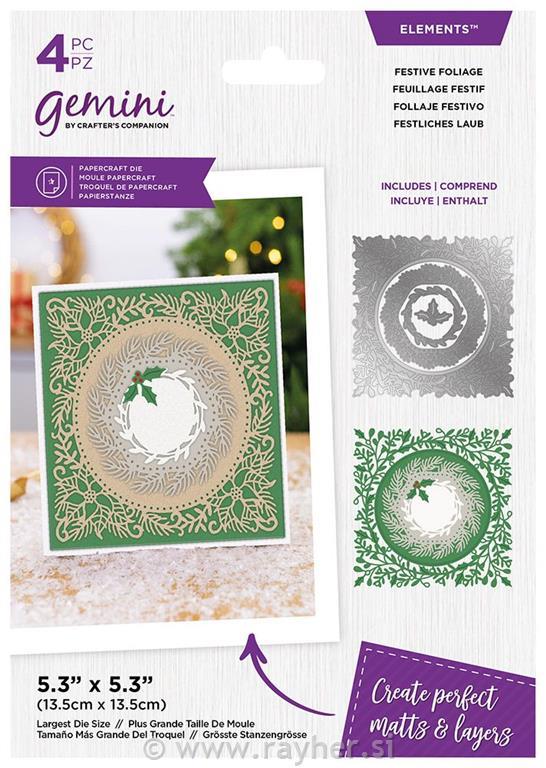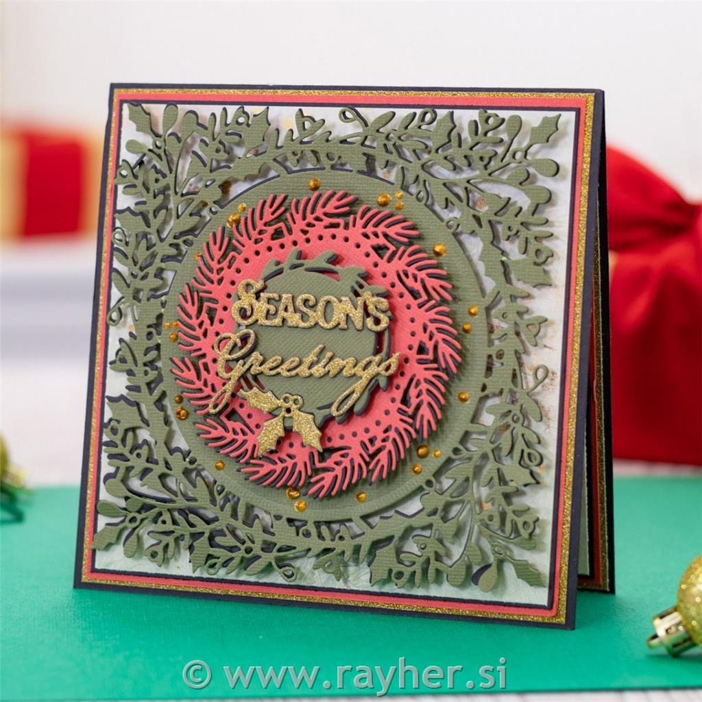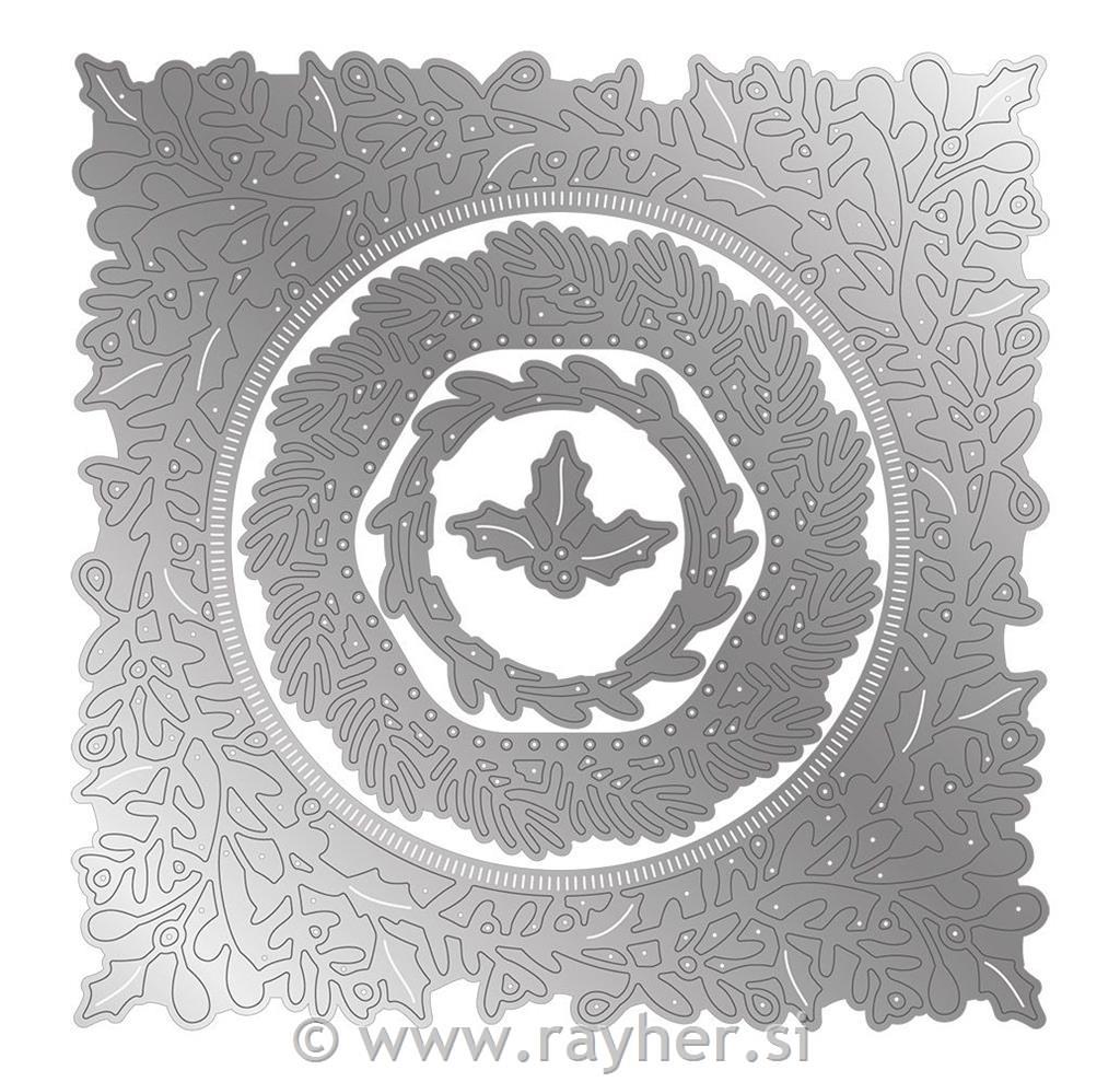 Komplet Praznično listje vsebuje štiri rezalne šablone za oblikovanje okroglih vencev, od katerih je vsak obrobljen s podrobno izrezanimi vzorci za oblikovanje zapletenega božičnega venca. Zunanji izrez kvadratne oblike vsebuje čudovito praznično listje in cvetje.