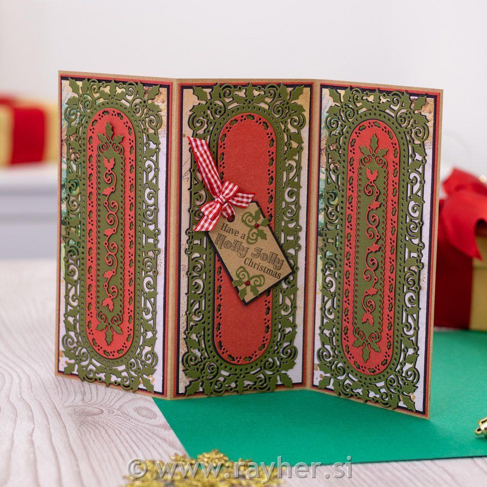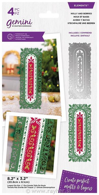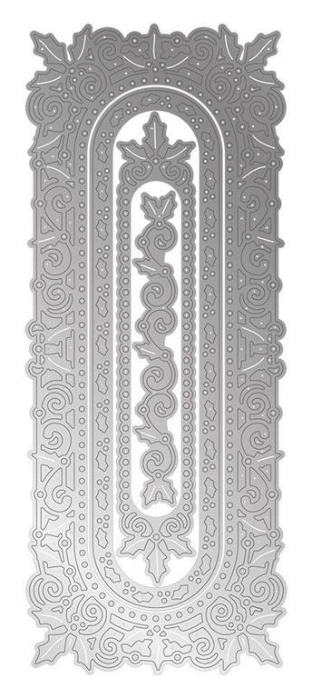 Komplet Holly and Berries vsebuje štiri rezalne šablone za izdelavo vitkih pravokotnih okvirjev, od katerih je vsaka obrobljena z nežnimi izrezanimi vzorcibož.drevca za ustvarjanje zapletenega božičnega dizajna. Najmanjša plošča ima linijo drobnih vrtečih se vejic pušpana, ki ustvarijo očarljiv končni učinek.