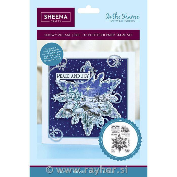 Komplet vsebuje 10 štampiljk za ustvarjanje zasneženega božičnega prizora v okvirju s snežinkami