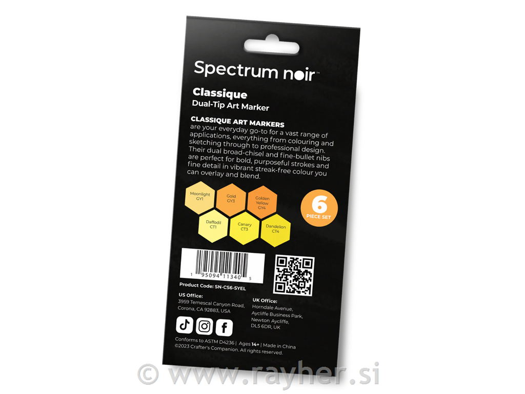 - Markerji Spectrum Noir Classique, zasnovani za natančno barvanje, mešanje in izjemno gladko senčenje, vsebujejo vrhunsko kakovostno barvilo na osnovi alkohola.