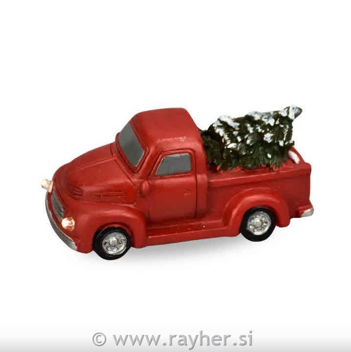 Zasnežen pol-tovornjak s smreko, rdeč, z LED lučko