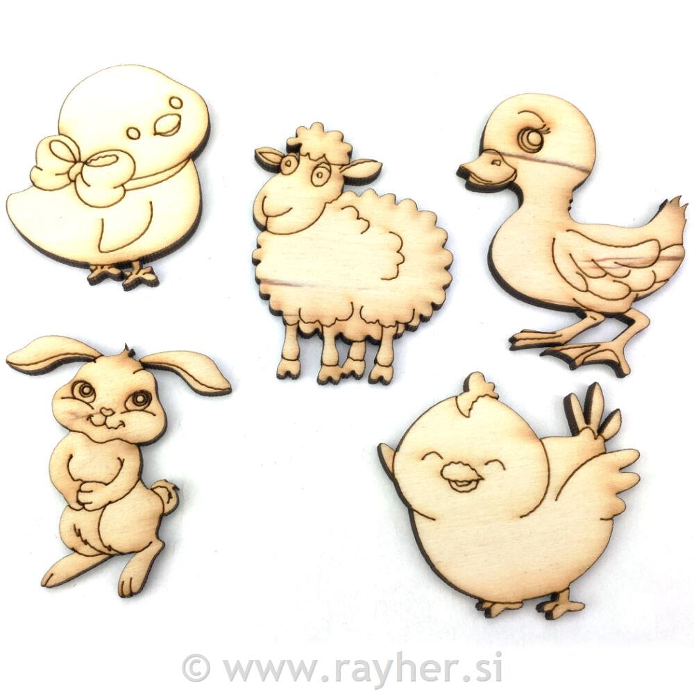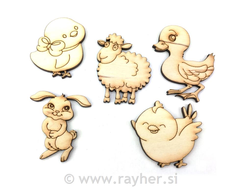 V setu je 5 živali; zajček, ptička, ovčka, račka iz naut lesa, ki jih lahko dodatno pobarvate ali pustite v naravnih barvah. Okraske lahko prilepite na voščilo ali jih uporabite kot del dekoracije.