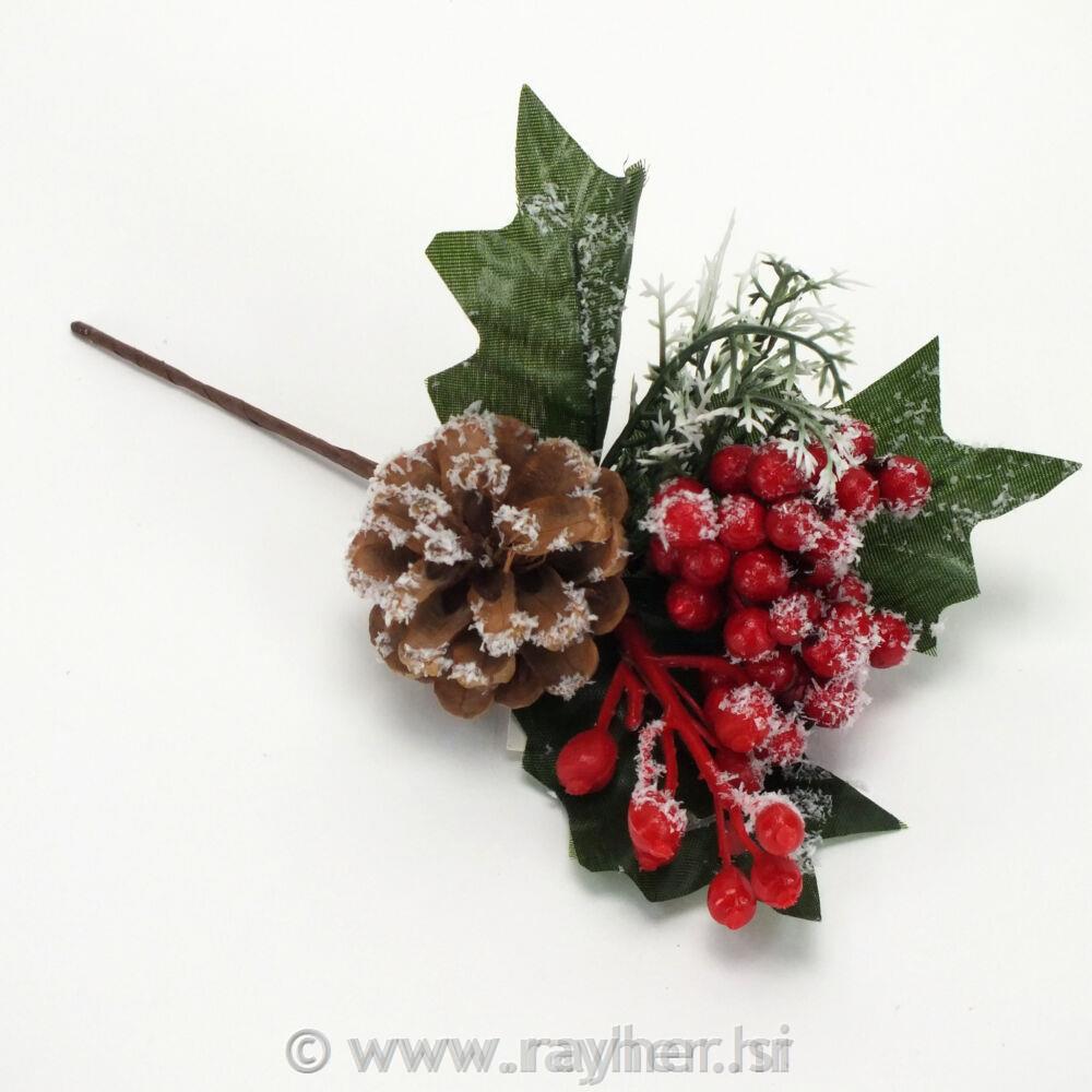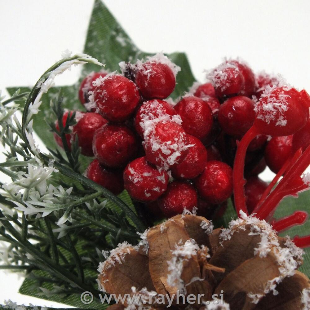 • Zasnežena vejica s storžem in rdečimi bunkicami, 18cm