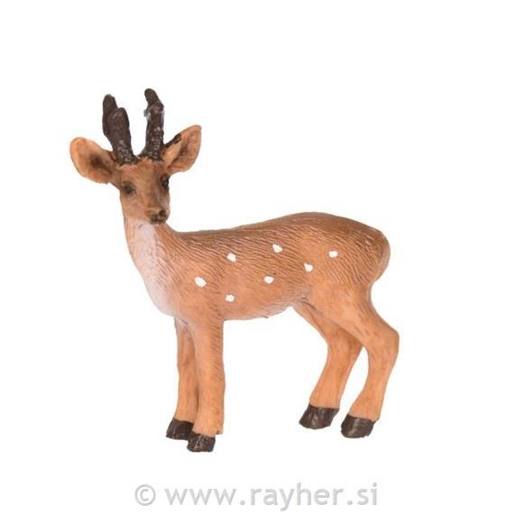 Figura srnjačka iz umetne mase, dimenzije 7,8x2,6x8,2 cm. Figura je samostoječa; lahko je del aranžmaja ali samostojna dekoracija.