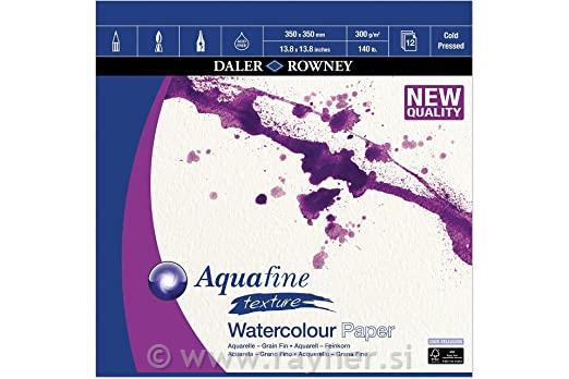 Akvarelni papir Daler Rowney Aquafine Texture ima klasično hladno stiskano površino za akvareliste, ki imajo raje rahlo teksturiran relief. Precejšnja teža 300 g/m2 nudi dobro vpojnost vode, odporna površina pa je zelo enostavna za uporabo in omogoča popravke.
